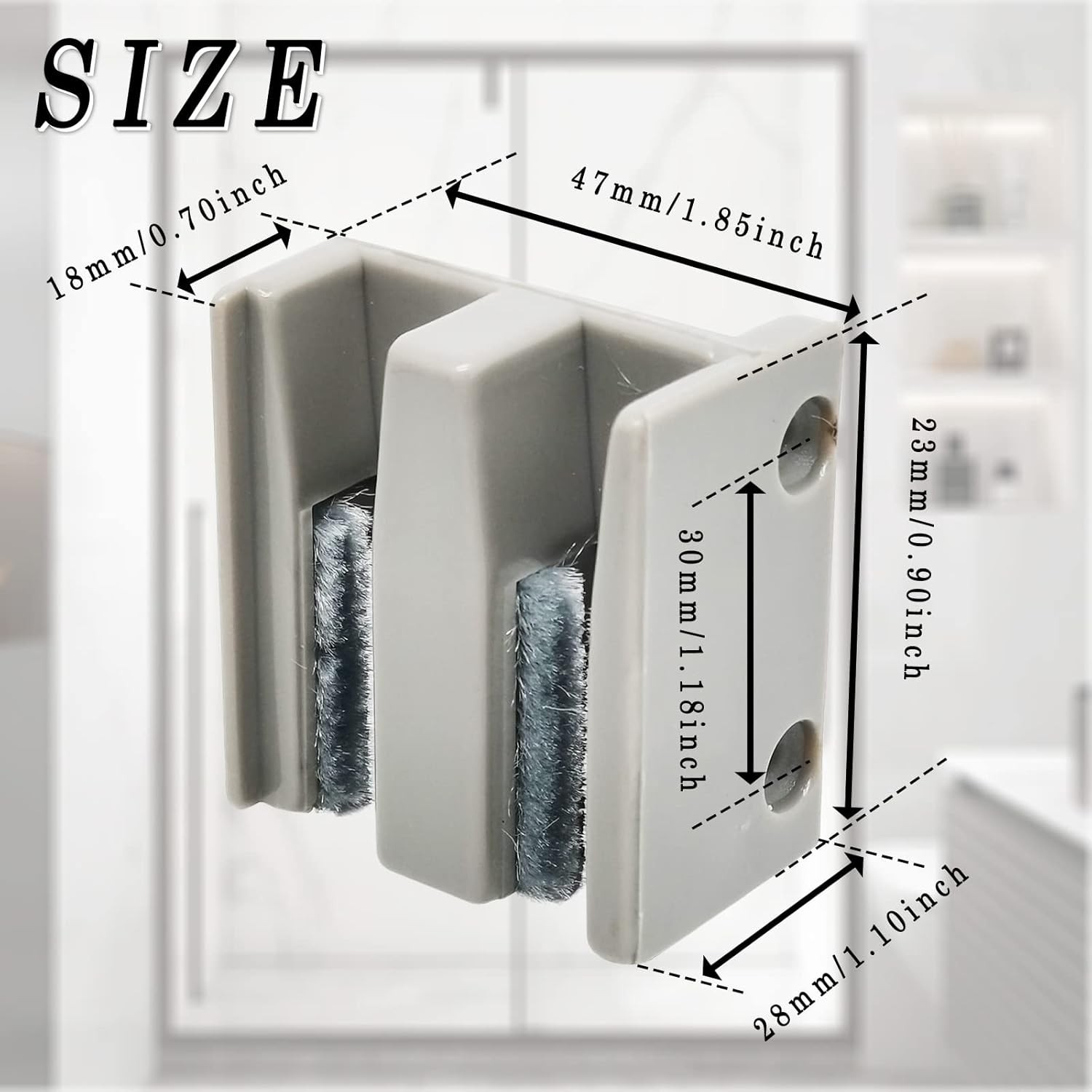 Sliding Shower Door Bottom Guide Assembly with Grey Fluff,8Mm(1/3Inch),Plastic Package Included:3pcs Shower Room Double Track Bottom Guides With Matching Screws. Material:Plastic, Sturdy Construction, Can Be Used For a Long Time. Size:Length:51mm/2.00inch,Width:47mm/1.85inch,Height:28mm/1.10inch、18mm/0.70inch. Applicable Glass Thickness:8mm(1/3inch). Function:Helps Keep Sliding Door Panels Centered On Their Respective Tracks.
