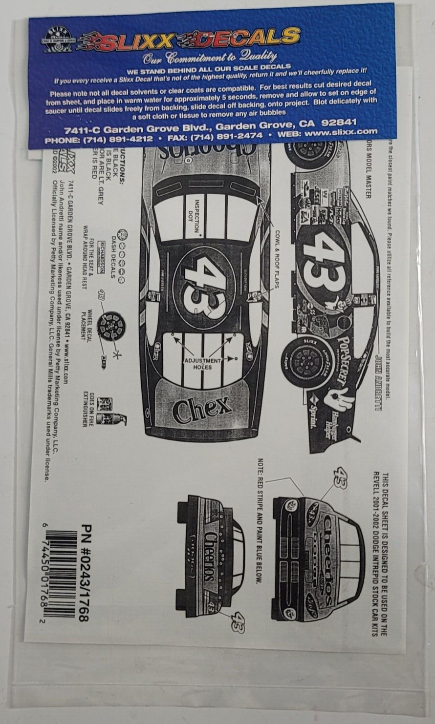 SLIXX DECALS New in Package! Part # 0243/1768 Description: #43 Cheerios Chex Stock Car Waterslide Decals NASCAR - DRAG - SPRINT - TRANS AM - Graphics Sheets 1:24 & 1:25 FOR REVELL 2001-2002 DODGE INTREPID Stock Car Kits Shipping USPS is the service used for shipping. We ship to all 50 states and APO addresses. International Buyers Import duties, taxes, and charges (typically collected upon delivery or pickup) are the buyer's responsibility and are not included in the item price or shipping charges. Please check with your country's customs office prior to bidding/buying to determine what these additional cost will be. Terms If you have any questions or need information, please feel free to email us via the link above. Please don't forget to check out all my auctions. Good Luck!