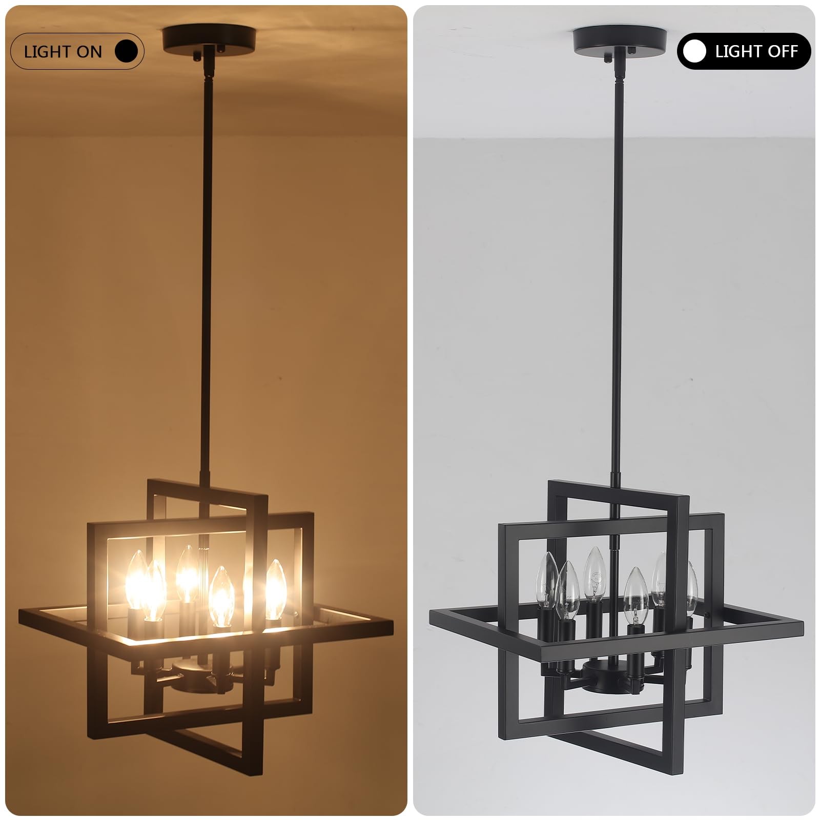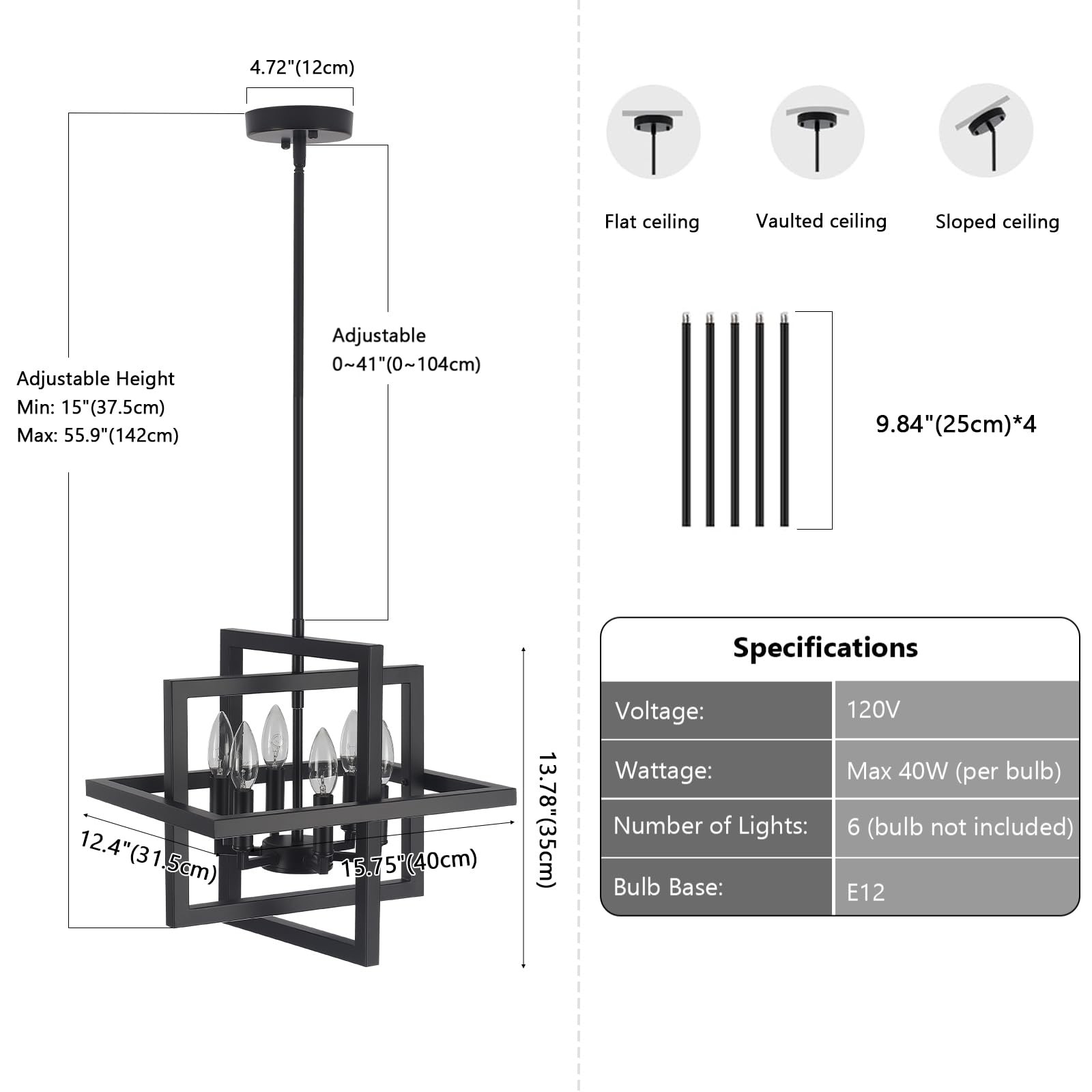 Modern small chandelier for entryway, Ajustable Hanging Height 15 inches to 55.9 inches. Modern Geometric Chandelier: The geometric design of this matte black chandelier seamlessly blends modern and industrial styles. Its unique appearance adds a stylish touch, making it ideal for various settings such as entryway, living room, kitchen island, dining room, hallway, foyer, stairway, cafe, and restaurant Ajustable Height & Angle: Hanging Height: 15" - 55.9". The lantern pendant light features 4 adjustable rods, each measuring 9.84 inches, allowing you to customize the hanging height of this dining room chandelier to suit your space and create the ideal atmosphere. Additionally, the rod can be rotated up to 180°, making hanging light suitable for installation on flat, sloped, or vaulted ceilings Durable & Easy to Install: This kitchen lighting fixture is crafted from metal with a spray-painted finish, ensuring sturdiness and durability while preventing rust, corrosion, or fading. This living room chandelier requires assembly, the package includes all mounting hardware and detailed installation instructions, there is installation video on the product page will guide you through the assembly process Compatible Bulbs & Dimmable: This 6-light modern chandelier for entryway is compatible with any E12 base bulbs such as Incandescent, LED, CFL and Halogen, etc. The dining room light fixture is dimmable when used with dimmable bulb and compatible dimmer switch. ※Bulbs and dimmer switch are not included Customer Service: If you have any issues when using our farmhouse chandelier, please contact us at any time. We are always committed to provide attentive services for you