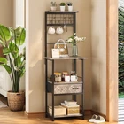 Small Coffee Bar Station Narrow Corner Coffee Stand Station with 2 Storage Fabric Drawers 5 S-Shaped Hooks for Small Spaces Farmhouse Bakers Rack for Kitchen, Entryway, Living Room Space-Saving Slim Coffee Bar Station : At 19.7"L x 14"W x 55.1"H, this rustic kitchen storage shelf adds timeless elegance to any corner or small space of your home. Whether used as a bakes rack, microwave stand, or coffee bar, it enhances the aesthetic appeal of your living space. Ample Storage Space: This coffee bar with 4 layers shelves and 2 fabric drawers is an ideal choice for your coffee corner. What's more, with 5 S-shaped hooks and pegboard, it is convenient to hang coffee cups and baking utensils, keeping your coffee corner neat, organized, and easy to access. Multifunctional Use in One: The stylish look is suitable for the kitchen, noy only be used as a coffee stand,buy also microwave oven stand, bakers racks, flower rack, printer stand or as a plant stand on the balcony, perfectly matching your living. Nice sleek design fits well with your kitchen, living room, bathroom, bedroom and any environment you need. Sturdy and Stable: This coffee stand with storage is composed of sturdy iron frames and grade particle boards, focusing on quality and durability. In addition, the microwave table is equipped with 4 adjustable feet, which can keep balance even on uneven ground. Assemble and Customer Care :All necessary hardware and step-by-step instructions are provided for assembly.If you have any issues, please contact us immediately, we will give you the best reply.