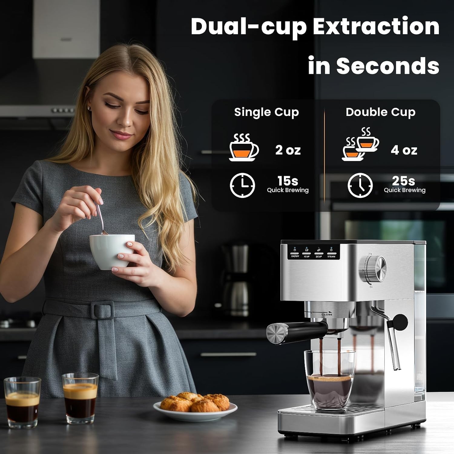 Small Espresso Machine 20 Bar, Cappuccino & Latte Machines with Milk Frother for Home, Stainless Steel Espresso Coffee Maker with 40 oz Removable Water Tank, Silver (Y#0819) About this item β[π΄πππ ππππ ππ¬π£ π¬πππππππ πͺπππππ π¨π π―πππ]: The Electactic Espresso Coffee Machine allows you to prepare espresso-based coffees at home, you can enjoy a barista-brewed latte, cappuccino or macchiato. Make single or double espresso shots with a beautiful layer of crema in minutes! β[π·πππππππππππ 20-π©ππ π·πππππππ πΊπππππ]: Semi-Automatic 2-in-1 Espresso Maker, with professional Italian pump and built-in temperature sensor, controls the coffee to be extracted at the optimal temperature (198 Β°F). This coffee machine gives you the confidence to make Barista-quality coffee with more fragrant and rich aroma. β[π΄πππ ππππππππ πΊπππππ]: Our espresso machine with milk frother has a powerful steam wand, so you can texture creamy, rich microfoam milk to create amazing milk foam art and enhance the flavor of your brews. You can create a cappuccino, latte or flat white at your home or office with our cappuccino maker. β[πͺππππππ, πΊππππππ & π·ππππππππ]: The beautiful and compact design makes this small espresso machine suitable for any size kitchen, especially for counters with limited space. Make single or double espresso shots with a beautiful layer of crema in minutes! Stainless steel appearance, stylish and durable, ideal gift for friend and family. β[πΌπππππ π»πππ]: Please kindly note that when switching between brewing coffee and frothing milk, please allow about 1 minute for the machine to heat up and cool down, otherwise it will enter overheat protection mode. The indicator light will flash repeatedly and need to be reset.