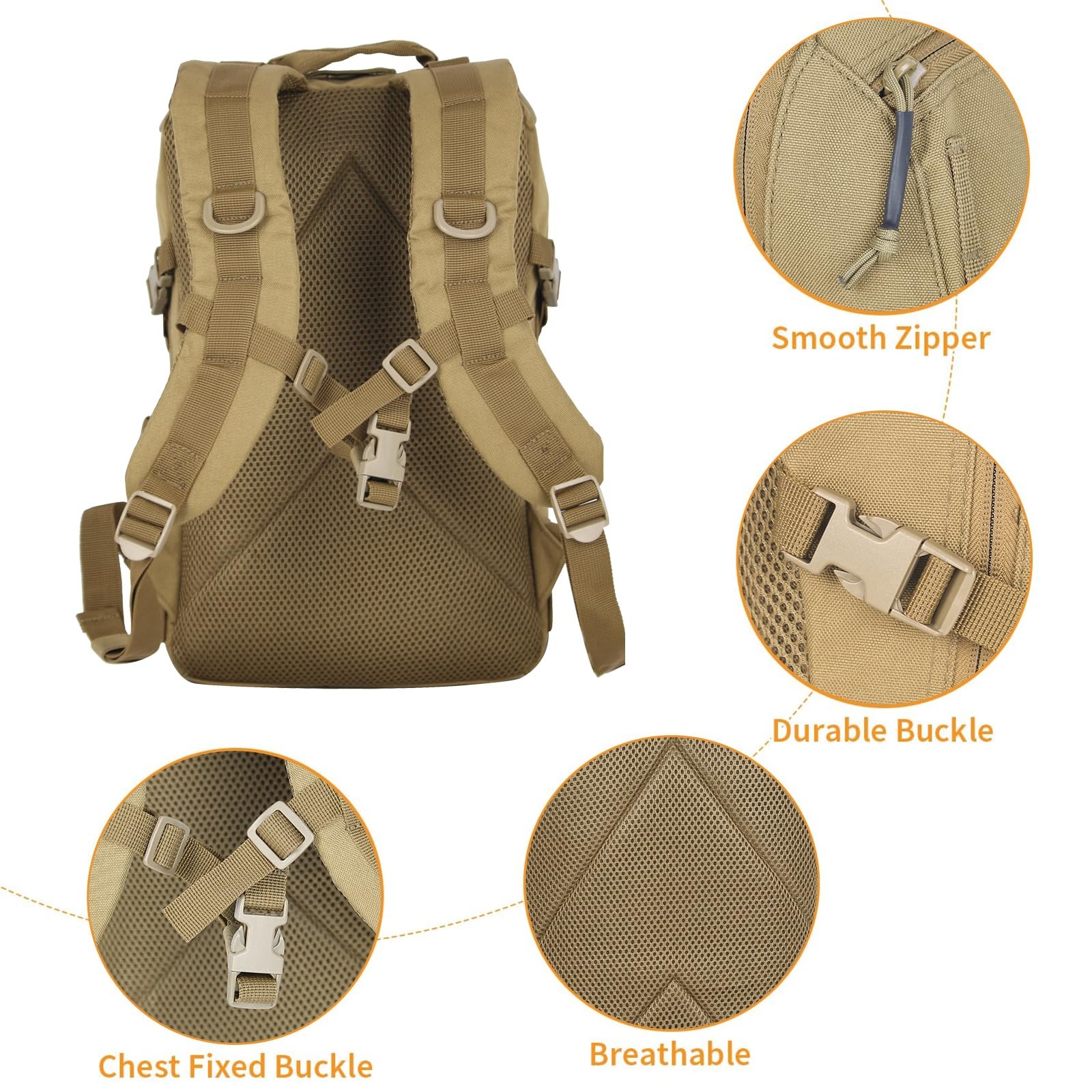 Specifications: Size:9"W x 15"H x 4.5"D Capacity: Mini 12L Backpack Made of 600 Denier polyester Large expandable main packing compartment (expands an additional 5”) Organizer pocket Molle webbing throughout for attaching additional tactical pouches or all the gear you need Easy grip zipper pulls Back support Thicken Breathable Sponge Padded straps and adjustable sternum slide Great for both indoor and outdoor use including hiking, hunting, fishing, camping, motorcycling, biking, small gear bag, small tool Bag, range bag etc. NOTE--- It is a very small backpack. It gives you plenty of room for gear and accessories while offering extensive modular storage expandability that allows you to determine how your kit should be organized 【Size and material】Size: 9"W x 15"H x 4.5"D inch.It is a 12L mini military backpack.The shell is tough and water-resistant and stitched with reinforced nylon threads.Ultra strong shell fabric and construction are made of 600D Nylon for long-lasting performance 【Large capacity multi-chamber】The large compartment has a large capacity and can put some clothes, books and other work supplies.The tactical backpack also has plenty of room, with a zippered capacity on the front and a small zippered compartment inside for those smaller items that are less likely to be found. Also, it has a unique compartment that can support up to 14.1-inch laptops and water bags, ipad and other tablet electronics 【Comfort】The back area & shoulder straps with adjustable chest strap are ventilated mesh padded design on your shoulders with yoke-style adjustable,Ventilated mesh padded back area & shoulder strap,breathable and comfortable 【Practical】The Molle Bag with Molle webbing for availability to add pouches and hook items onto.Put a patch panels at the front to stick your name patches and morale patches.Conventional molle system, side webbing molle system, multi-grid design. Multiple D Rings on the top and shoulders traps 【Multi-purpose】Great for both indoor and outdoor use including hiking, hunting, fishing, camping, motorcycling, biking, small gear bag, small tool Bag, range bag etc