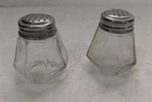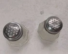 This vintage set of small salt and pepper shakers features a ribbed pattern and metal lids, providing a classic 1950s style. The shakers are round in shape, clear in color, and measure 2 inches in length. Suitable for all occasions, these shakers are designed with lids for convenient use. The set includes both a pepper shaker and a salt shaker, making them a charming addition to any kitchen or dining table.