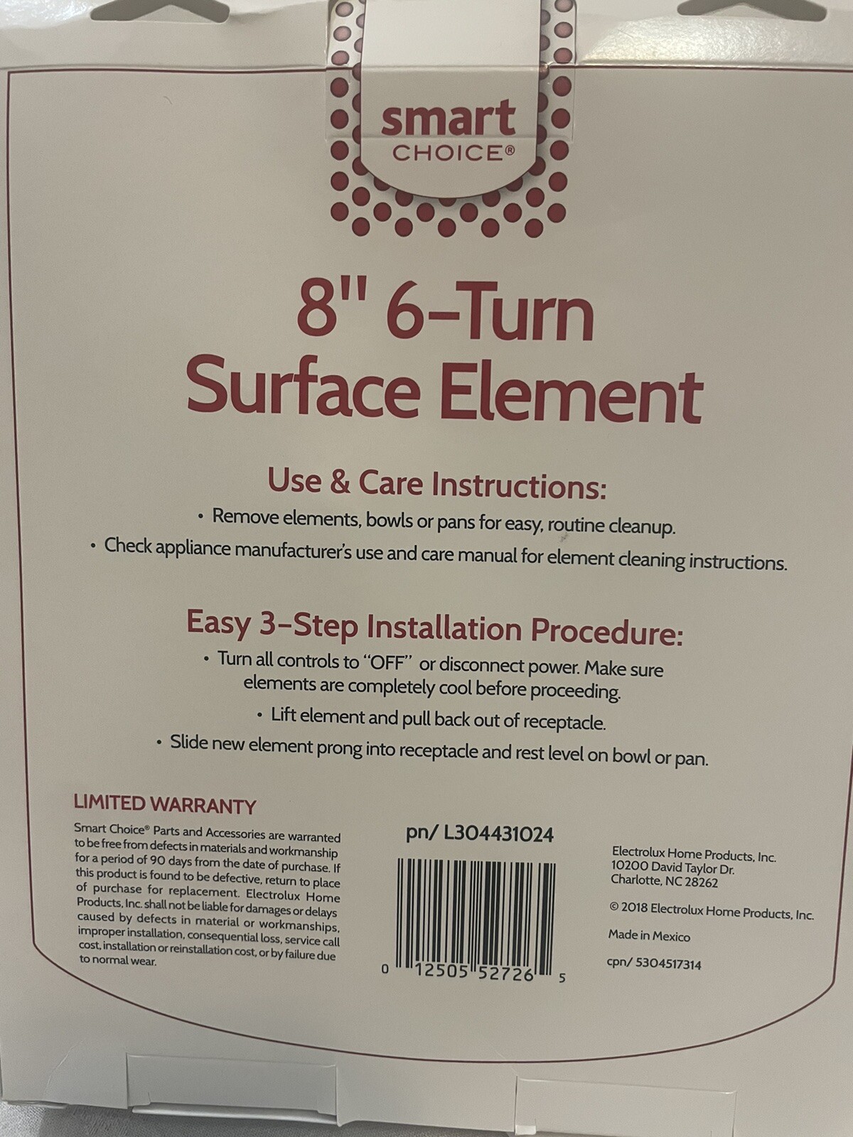 The Smart Choice 8โ-6 Turn Surface Element is a replacement part for cooking appliances, specifically compatible with GE, Hotpoint, RCA, and some Kenmore models. This electric element is made of stainless steel and features sealed burners, making it suitable for ranges and cooktops. With a slide-in installation, this black element offers a capacity of 8โ-6 turn surface, providing a convenient and efficient cooking experience. The Smart Choice brand ensures quality and reliability for your kitchen appliance needs. For use with ranges and cooktops manufactured before June 15, 2018. Fits select Kenmore prior to 2004- New- Smoke free home- Thanks for stopping in check out my online thrift stuff added daily much love Shelly J ๐