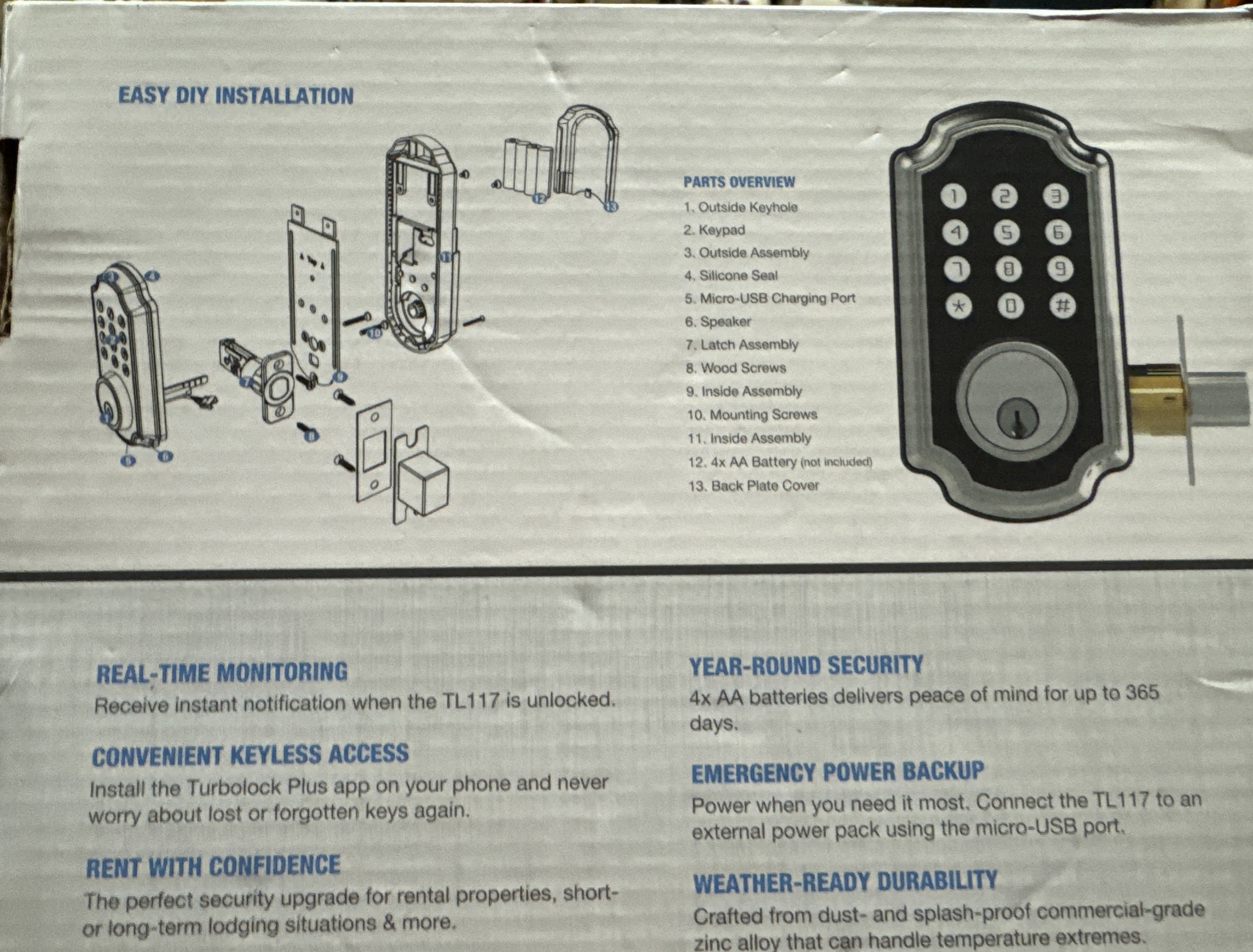 Secure your home with the TurboLock TL117 Smart Lock. This modern door lock is made of high-quality zinc and finished with oiled bronze for a sleek look. It comes with a keypad for keyless entry and voice prompts for added convenience. The TurboLock TL117 is suitable for front and side entrance doors, and is easy to install with its universal mounting. With Bluetooth capabilities, it can be easily connected to your phone and includes a manufacturer warranty of one year. The package includes all necessary hardware, instructions, and a key for backup. Get the TurboLock TL117 Smart Lock for a reliable and stylish security solution. 🔥🔥🔥I DO NOT SHIP OUT THE CONTINENTAL UNITED STATES🔥🔥🔥 🙏🙏🙏 FIRST AND MOST IMPORTANT PLEASE CONTACT ME FIRST IF YOU ENCOUNTER PROBLEM WITH ITEM PURCHASED. I NEVER INTENTIONALLY TRY TO TAKE ADVANTAGE OF ANYONE. PLEASE GIVE ME OPPORTUNITY TO MAKE RIGHT BEFORE LEAVING NEGATIVE FEEDBACK. 🙏🙏🙏 🔥MERCHANDISE DISCLAIMER 🔥🔥PLEASE READ THIS BEFORE BIDDING OR BUYING ANY MERCHANDISE FROM ME🔥🔥. I’ve been selling on eBay only a short time and my experience has been overwhelming POSITIVE, but I still want to post this on all my listings for me and for you. I resell items that are sometimes brand new sometimes new but in an open box and sometimes used. If an item I sell is new I don’t open and inspect if it’s been opened but still in manufacture wrap I don’t test, we have all opened boxes in a store to peek. If it looks to have been removed I test mainly for power and digital functionality. But I am in NO WAY a person who could answer your questions about every item I sell. I suggest you Google. I do not except returns I don’t do this full time so if your looking for perfect boxes and definitely non opened items please don’t bid here, I find great deals and love offering them and making both of us happy 😃. But I’m not Macy’s or Dillards I buy and resell anything that is what I consider a great buy. So in conclusion if you buy from me please ask any questions before bidding or buying, I may not have an answer that suits you and that’s okay. There are millions of options on eBay. Happy shopping and I hope you find great deals.