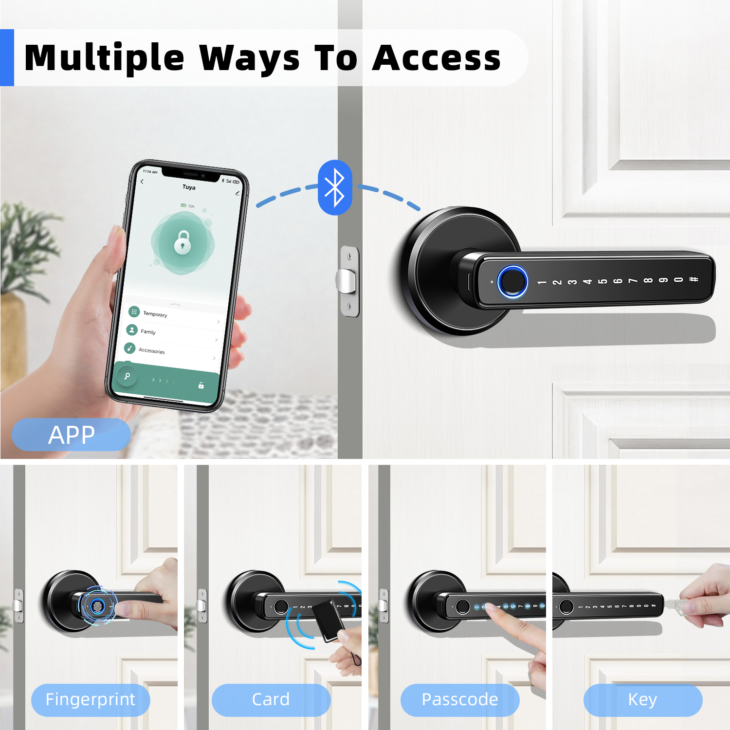 This smart door lock offers a convenient and secure 4-in-1 keyless entry with fingerprint, Tuya app, password, and physical keys. Featuring an upgraded 360° live fingerprint sensor with 99% accuracy and 0.3-second unlock time, the lock also supports app control for fingerprint management, unlock history, auto-lock, and passage mode. Combining a classical door knob design with modern smart features, this lock is easy to install and fits most US doors, providing a seamless and secure solution for your home or office. 【4-IN-1 Unlock Ways】 Volibel smart lock has 4-in-1 keyless entry door lock: fingerprint +Tuya APP Bluetooth +password + 2 physical key. We have increased the storage space of lock, stores up to 50 fingerprints and 100 password codes. The elderly and children can easily use, free entry and exit. Eliminating the trouble of carrying key with you. 【Upgraded Fingerprint Sensor】: The fingerprint door lock in black is equipped with upgraded 360° live fingerprint, and the recognition accuracy rate is up to 99%, one touch unlocks in just 0.3second, and the upgraded fingerprint reader will be more durable, stable and accurate. Buy Volibel smart lock to make your home more secure and convenient, worth choosing. 【Simple but Smarter and Securer】 The biometric door lock support App control, easily get fingerprint manage, app check unlocks records, auto lock, passage mode, secure lock, help you create a smarter and much convenient life, guard your family safety. 【Classical Design but Stronger】 The biometric door smart deadbolt extended the classical door knob design, equipped with fingerprint lock function and modern App control, a very ideal fingerprint doorknob smart lock for bedroom door, office, apartments, hotels. 【Easy Installation】 The fingerprint door knob door lock can be easily installed with a screwdriver within minutes, fits most US door, easily replace with existing door locks. Unlocking method: fingerprint unlocking, password unlocking, Tuya APP unlocking; Fingerprint password lock when fingerprint or password is not registered.The device will not turn on the Bluetooth network configuration mode.Before connecting the Tuya APP, you need to press the fingerprint or password first, then the device wakes up and turns on the network configuration mode for 1 minute;After the lock body is restored to factory settings,all data in the device will be cleared; Password: if there are 10 digital keys (0-9)for the touch code of the machine, the number of digits of the user password is 6-12 digits; The dynamic password generated by the APP has 6-12 digits,and the user can directly enter it at the lock end to unlock;