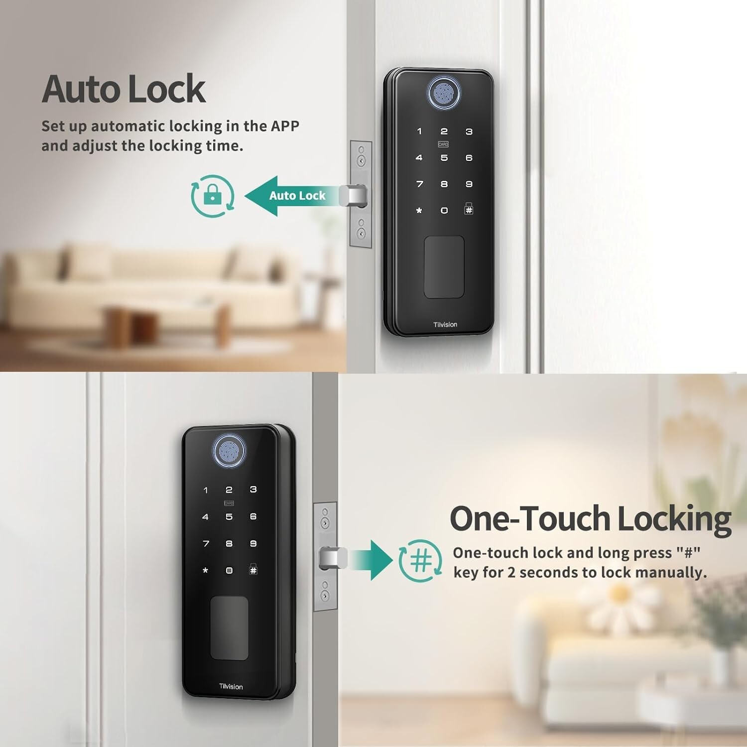 Fingerprint Door Lock,Keyless Entry Deadbolt with App Control,Touchscreen Keypad - Auto Lock & IP65 Waterproof - Smart Door Lock for Front Door,Home,Office About this item 【Multiple Unlocking Methods】Tilvision Smart Door Lock offers a range of unlocking methods, including APP program unlocking, fingerprint unlocking, password unlocking, Fob keycard unlocking, mechanical key unlocking, and even Alexa voice unlocking (gateway needs to be purchased separately). Giving your kids, friends or anyone else who wants to get in more flexibility and a new smart home experience. 【Remote Control Unlocking】Using our smart electronic door lock mobile app, you can remotely control access control management. Grant permanent or temporary unlocking privileges to your family members, remotely generate one-time passwords for visitors, and easily track unlocking history - all from the convenience of your smartphone. Stay connected and informed even when you're not at home.(Gateway required) 【Multi-functional Security】Tilvision fingerprint door lock features auto-locking, one-touch locking, stand-alone mode and low battery alarm, anti-prying and anti-hacking touch screen keypad, and IP65 waterproof rating to protect your home security around the clock. 【Humanized Design】 For security reasons, the lock will automatically lock for 1 minutes when the code is incorrectly entered more than 5 times. The digital door lock has a USB-C port, when the battery inside the lock is completely dead, it can be unlocked by plugging in the emergency power supply to start temporarily. If the battery is low or there is any other malfunction, you can unlock the door using a mechanical key. Perfect for houses, Airbnb, apartments, offices and hotels. Product Description Play Video Play Video Previous page Smartphone App Control With the Smart Life App, tapping your screen within Bluetooth range and gaining access in seconds. Next page App Control Member Management Home Management Access Log Temporary Code Voice Control (Gateway is Required) Our smart locks work with Alexa to achieve voice-controlled opening and closing of doors after connecting to the Tuya gateway. Previous page Auto Lock & One Touch Lock Set the auto-lock function in APP, and the auto-lock time can be set from 10 seconds to 30 minutes. Long press the "#" button for 2 seconds to lock the smart lock quickly. Next page