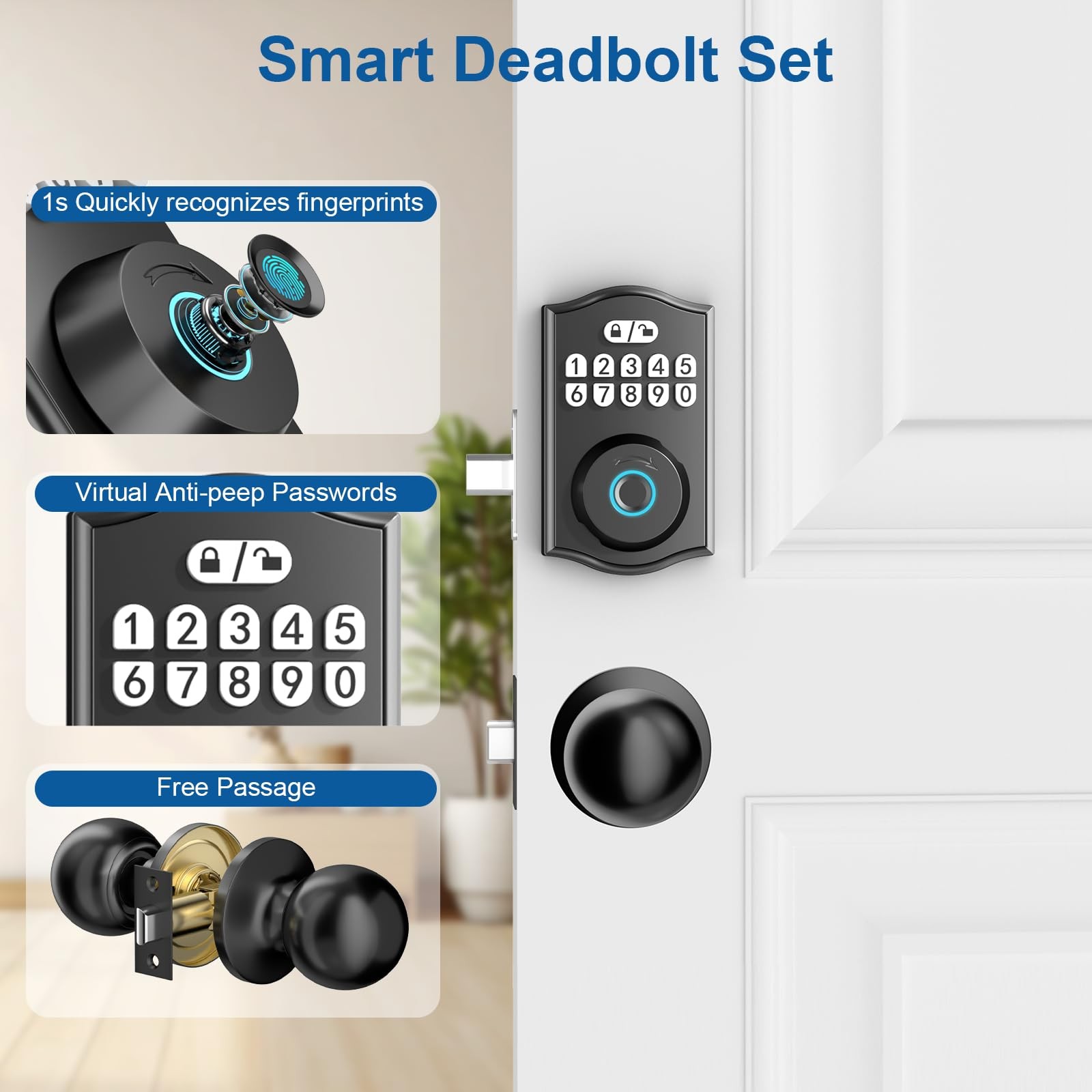 1 【6 in 1 Smart deadbolt lock door knob sets】: BAFUWEIY keyless entry door lock deadbolt with handle set provides multiple access ways to unlock: full APP control, fingerprint, passcode, physical keys, 2 door knob, one-time code; 【Intelligent App Operations】: One cell phone solves all your problems. With our electronic keypad deadbolt you can add your fingerprint, password, Sharing one-time password with your family and friends, manage users, view access history and setting the auto-lock in the app; 【Security and Peace of Mind】: Keyless entry door lock deadbolt with handle set gives your home double the protection it needs. It can also be set to automatically lock from 5 seconds - 99 seconds. Never worry about forgetting to lock your door again.After 5 consecutive failed password/fingerprint authentication attempts, the system locks up for 2 minutes. 【Easy Installation】: Keypad door lock with handle set just need a screwdriver, you can easily finish installation and programming in minutes. It is compatible with all American standard left and right-handed doors. Reminder: The machine screws come preinstalled in the handle. Please remove them before installation; 【Hassle-free service】: Digital door lock fit most standard American single cylinder doors. Installation is simple, requiring only a screwdriver (included) and no additional drilling. We also provide instructions, installation and setup videos. Please feel free to contact us with any questions and we will answer them for you ASAP. Perfect for bedrooms, rentals, apartments;