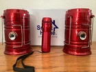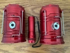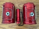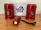 “Smart Home” Essentials for Living. 2 Lanterns and 1 Flashlight Emergency Set. Color Red. Model # 000EK5. Each Lantern Uses 3 AA Batteries and Flashlight Uses 3 AAA Batteries. Lanterns Can Also Be Used as Flashlights. Body of Lanterns Extend to Expose Bright 5 LED’s. Smaller Flashlight has Bright 3W LED Light with Zoom Function. Flashlight Measures 4 1/8” in Length. Lanterns Measure 5” Tall Before Bodies Have Been Extended and 3 1/2” Across Base. Lanterns Have Handles. NEW in BOX