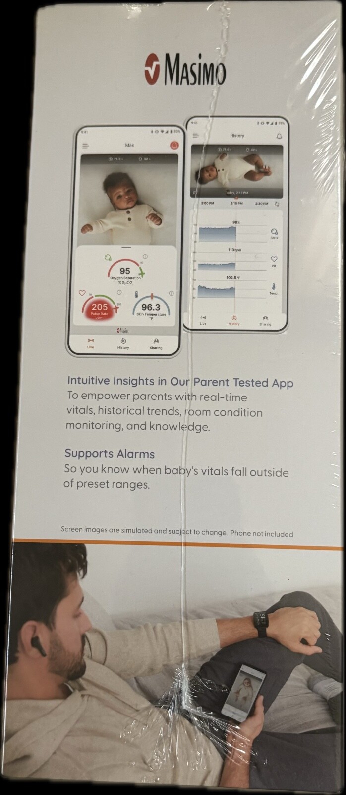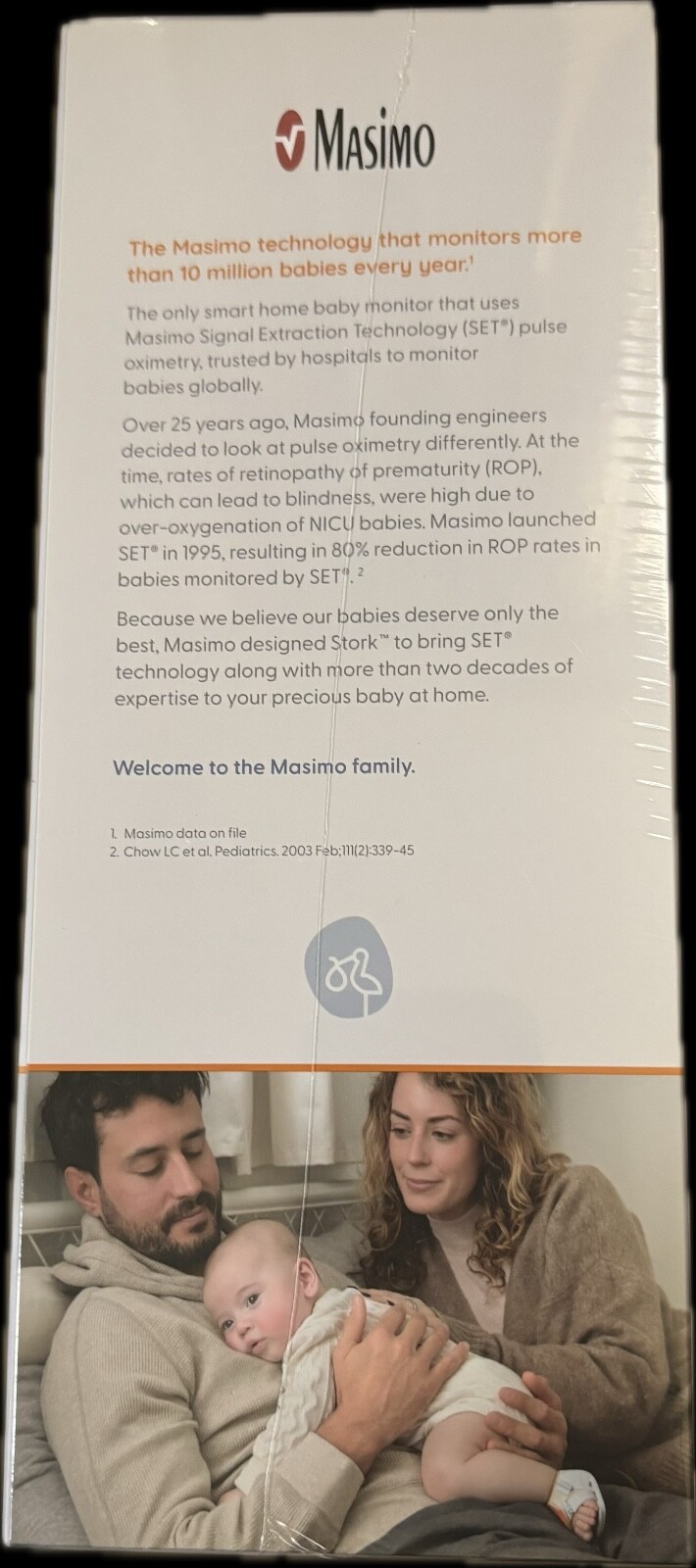 Brand new item in original packaging with quick shipping. Stork's FDA cleared Vitals+ bundle continuously monitors baby’s vitals like oxygen saturation, pulse rate, and skin temperature. Visual and audio alarms are provided when oxygen saturation and pulse rate fall outside preset ranges and customized alerts can be set up for changes in baby’s room conditions or sleep position, providing peace of mind knowing you'll be notified when your baby may need attention. Stork's flexible, medical-grade silicone boot ensures baby's comfort while sleeping and our quad high definition (QHD)-capable camera with crisp two-way audio allows you to see, hear, or talk to your baby from anywhere, any time.. The Stork™ Boot: Designed for comfort and photo-ready moments, the Stork boot comes in three sizes for babies up to eighteen months old (sizes small and medium included in Vitals+). Simply pop your current Stork Sensor into the Stork Boot’s soft, flexible silicone frame as your baby grows. The boot’s sensor lasts sixteen hours on a full charge, and you can recharge to full in only two hours. The Stork™ Camera: The Stork Camera is quad high-definition (QHD)-capable and equipped with zoom in and pan out functions, room condition monitoring, and two-way audio. See if your baby is asleep or awake and listen or talk to your baby any time, from anywhere, day or night.. The Stork™ App: Monitor your baby's vitals on Stork's parent-tested app. Receive alarms when baby's pulse rate or oxygen saturation falls outside of preset ranges, set up alerts for changes in baby's room condition or sleep position, and enjoy a full 24-hours of video history. Disclaimer: Masimo Stork is not intended to replace the monitoring, diagnosis, or treatment provided by a physical or healthcare provider. Masimo Stork is not intended for use with infants and neonates previously diagnosed with cardiovascular or respiratory disease or conditions. For use with healthy infants 0 to 18 months of age and between 6 to 30 lbs. • The only FDA cleared baby monitoring and alert system that uses the same SET® technology that’s been trusted in hospital NICU’s for 25+years and the first and only system that’s cleared for use the first day you bring your baby home • FDA cleared second-by-second vitals monitoring with alarms when oxygen saturation and pulse rate fall outside of preset ranges • Proven to perform through motion, all skin tones, and low blood circulation • Crystal-clear video and crisp two-way audio with 24 hours of video history • Alerts for room conditions and baby’s position (face up or face down) • Quad high definition (QHD)-capable camera provides crystal clear picture, day or night • Zoom in/pan out functions, room condition monitoring, and two-way audio • 24 hours of video history • Boot is made of soft, flexible silicone for comfort, easy to clean in the washer after simple removal of the sensor