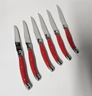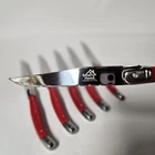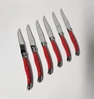 Smart Home Essentials for Living Set of 6 Red Handled Steak Knives. Excellent used condition. Blades are like new, and handles are glossy. Approximately 9" long. Please see photos. US shipping only.