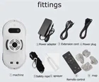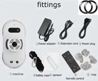 Packing list: 1 host 1 power cord + adapter, 1 remote control 1 extension of 4 meters 1 safety rope 6 cleaning cloths 1 manual (or English manual) 1 after-sales warranty card Using way: 1. Wait 20 seconds after starting up until the blue light stop flashing,Then start working. Because the robot need 20sec to detect the glass plane. 2. Binding the safety rope when using, Prevent falling from high altitude. 3. Spray some water on the edge of the Mop when working, will be better effect.