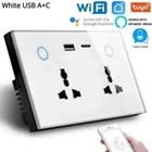 Smart WiFi Wall Socket with USB Socket Charger Smart Switch Outlet Plug Works with Amazon Alexa Echo, Google Assistant, Nest No Hub Required Color White Size (L) 147*(W)86*(H)38mm Weight 191g Material PC Voltage range 90-250V AC Max current Current of USB Port 13A each max 2.1A, total 4A Wireless frequency 2.412~2.484GHz Wireless IEEE standards IEEE802.11b/g/n Security type WEP61/WEP/128/TKIP/CCMP(AES) Security mechanism WEP/WPA-PSK/WPA2-PSK Wireless consuming <=0.3W Working condition Temp: -30~60 degree Feature Support WiFi network. SmartLife App, Support Amazon Alexa and Google home. Support Smart configure net technology, easy to access settings. Support status tracking, home appliances status timely feedback to your device. Support Max 150 WiFi smart devices from one smart phone. Easy installation, easy handling and can be activated immediately and stably. FCC,CE, ROHS, RED approval. Wi-Fi wall socket connects to the Internet through WiFi network and controls the power of home appliances, smart phone or other device can control the socket and track the status of wall socket at any place where network is available, one device can support more than one WiFi wall socket controller. WiFi wall socket using Smart Link net technology you can Easily access settings, besides, it has timing function you can DIY for your favorite and Power indicator for your energy tracking, let you have fun on local or remote control your Home appliances, enjoy with it. SET-UP IN 4 EASY STEPS 1. Download the Smart Home app from the App Store (iOS) or the Play Store (Android). 2. Plug the device on the Smart Plug's socket. 3. Pair the Smart Plug with the Smart Home app. 4. Integrate with Amazon Alexa by adding Smart Home as a skill, or with Google Home by adding Smart Home as a new device. COMPATIBLE TO MOST HOME APPLIANCES This SMART WiFi Plug Socket can automate any home device (available with BS plug) and support a maximum of up to 2900 W which covers most home devices like lamps, fans, audio systems, coffee makers, kettles, chargers, portable heater, etc. CONTROL RIGHT FROM YOUR MOBILE Scan the QR code or download the "TUYA" app available on the App Store (iOS) and Play Store (Android) and download. Monitor all your plugged devices and have real-time control right from your mobile. SCHEDULE ANY DEVICE AND SAVE ENERGY No need to worry about plugged devices when you're at work or on vacation. Set your device lamp, air conditioning system, heater, humidifier, and more to automatically switch on or off based on specific times you set through the app. Also, save on power consumption. WORKS WITH AMAZON ALEXA & GOOGLE HOME The new SMART WiFi Plug is perfectly compatible with Amazon Alexa (Echo and Echo Dot) and Google Home/Assistant. Assign a name to each Smart Plug and activate any device chargers, coffee maker, lamp, oven, ac system, etc. via voice commands. SMART COMPATIBILITY The new SMART Wall Socket is perfectly compatible with Amazon Alexa (Echo and Echo Dot) and Google Home/Assistant, and Nest. Assign a name to the smart socket and activate any device coffee maker, lamp, ac, oven etc. via voice commands. CONTROL YOUR APPLIANCES RIGHT FROM YOUR PHONE Scan the QR code or download the app available on the App Store (iOS) and Play Store (Android) and download. Monitor all your plugged devices and have real-time control right from your mobile. PERSONALISED SCHEDULE set your device or appliance lamp, air conditioning system, heater, humidifier, and more to automatically switch on or off based on specific time you set. No need to worry about leaving your appliances on before you leave your house! ENERGY SAVING FUNCTION has a power saving function so the device can be set to only be switched on when in use and no electricity would be wasted. DEVICE COMPATIBILITY This SMART WiFi Plug Socket can automate any home device and support a maximum of up to 2200 W which covers most home devices like fans, audio systems, coffee makers, kettles, chargers, portable heater, etc. to conveniently convert your home into a smart home. WIFI WALL SOCKET This innovative Twin Socket with USB Port can easily convert your appliance into a smart device, ultimately turning your home into a smart home in no time. Simply plug any home appliance and control it right from your mobile phone. With USB ports, you can easily charge your mobile, tablet, or any USB-powered device with a standard cable. Package: 1*Smart wifi wall socket 2* Screw 1* Manual
