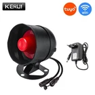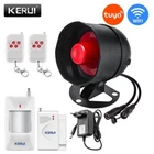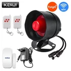 KERUI Tuya WIFI Wireless Home Siren Speaker Burglar Alarm System Local Security Alarm Motion Detector Window Door Sensor DIY Kit Tuya Smart Control Add WIFI function under the original You can receive an message alert immediately anywhere.even if you are not at home Four types of defense zone attributes. such as adjusting armed when going out. If you don't want the device to work, you can set it to disarmed. Only the emergency area device will work. You can switch to Home mode when you are at home. Sensors can be custom named, Different sensors have different functions How does this siren alarm system protect your house? 1.Press arm key on the remote controller.and then the siren will at work to protect your house. 2.When the door sensors ,PIR sensors,curtain detector or other sensor be triggered,this siren will sound 3.You can control disarm by remote controller.otherwise it will keeps sounding about 2 minutes then stops itself if no one disarms it. Can add more accessories or Hosts.one sensor can work with more then two siren alarm hosts.Can be placed in different areas. One sensor can work with more then Alarm Hosts. 110dB Sound Alarm,The sound cannot be adjusted down or up Adjustable iron fixing bracket. The remote control has three functions Arming and disarming Emergency button Doorbell mode The Max Working Distance Between Host and Accessories is 100M (open space). Host speaker Size: L*W*H 12mm * 10.2mm * 11mm Power Adapter: DC9V1A (included) Power: AC 110-240V the length of the power cable is about 92cm/3ft,can be extended by yourself. the wireless operating frequency: 433MHz the use of the environment: stability: 0 ℃-55℃ , Relative Humidity: 40% -70% the alarm sound: greater than 110 db Q&A: Q: Do I need to order an alarm panel (control center) for this siren? A: No, this siren work as an alarm system, it can work with wireless sensors to protect your house. Q: Does this siren system support add extra sensors or remote controllers?How many? A: Yes! This siren alarm system can work with 10 remote controllers and 40 wireless sensors like wireless gas detectors, smoke detectors, co carbon detectors, door/window sensors, pir motion detectors, water leakage sensors, vibration sensors and glass break detectors and so on. Q: Can I control 2 or more sirens by using 1 remote controllers or more? For example, I have 6 rooms and want to install 6 sirens and all control by 2 or more controllers? A: Yes! User can use 1 remote controller to control 2 or more siren systems, or 1 sensors work with 2 or more siren.