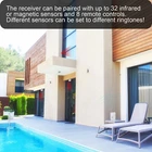 Dual monitoring detection: infrared and radar dual sensing, low false alarm rate. The flashlight of the detector screen can be turned off to make it more private. The receiver will only ring or vibrate when infrared and microwave sensing AT THE SAME TIME. It provides security and security for your property and loved ones. Loud horn & Mute Vibration: Professional high quality speaker with up to 113dB loud alarm effectively deters thieves. 8 chord music chip, loud and melodious ringtone is generated via the 40mm speaker. There are 5 levels adjustable volume including Mute(Vibration). The color of the indicator light and the song selected can distinguish which sensor is triggered. Strong transmission distance: The transmission distance in outdoor streets is about 150M; the transmission distance indoors is about 30M. The sensor has a sensing radius of 2-8M and the attached cover allows for a more concentrated testing distance. With IP64 waterproof, the sensor is suitable for indoor and outdoor, such as entrance, gate, driveways, garages... Other applications are waiting to be discovered by you! DIY pairing: you can choose the number of transmitter and receiver as needed. Each receiver can learn a maximum of 32 infrared, magnet, etc. wireless sensor accessories and 8 remote controls. You can distinguish which sensor was sensing by the Indicator flashlight and the ringtone. It can be set during pairing. Easy to install: Determine the detection range and adjust the angle of the sensor. Stick or nail the sensor to the surface to be monitored. The sensor can only be powered by battery. Place the receiver on the table or other, the receiver can be powered by the battery or usb cable. Remember to use alkaline batteries. Parameter: Condition 100% brand new Powe Supply(Receiver) Micro USB or AAA alkaline battery x 3 (not included) Waterproof IP64 Power Supply (PIR Transmitter) AA alkaline battery x 3 (not included) Color White Battery lifespan 5-7 months (based on 30 minutes per day) Material ABS Wireless range 2 - 8 m/6.6-26ft Volume 113~0dB Motion detecting range 433.92MHz Wroking Frequency 433Hz Certification CE, CCC, CQC Note:The volume level of the different ringtones is a little different. On Feb 12, 2025 at 12:37:58 PST, seller added the following information: