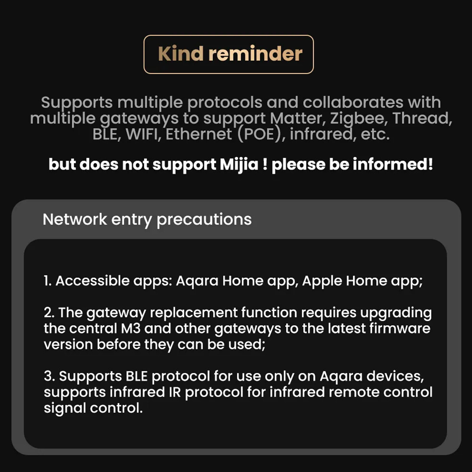 Smart Hub M3 WiFi Fast Connection Bluetooth Smart Home Control Center Gateway Supports multiple protocols and collaborates with multiple gateways to support Matter, Zigbee, Thread, BLE, WIFI, Ethernet (POE), infrared, etc. but does not support Mijia ! please be informed! [Network entry precautions] 1. Accessible apps: Aqara Home app, Apple Home app; 2. The gateway replacement function requires upgrading the central M3 and other gateways to the latest firmware version before they can be used; 3. Supports BLE protocol for use only on Aqara devices, supports infrared IR protocol for infrared remote control signal control. [Multimode gateway] It is both a central hub and a multimodal gateway, which easily enables the interconnection and interoperability of devices with different protocols, achieving the ideal full house intelligence. [Gateway data migration Easy replacement of old and new] The Ark Smart Center M3 can transfer data from key gateway functions such as devices and automation scenarios in Aqara's gateway devices to itself, easily completing data migration. Packing List: 1 x M3 Gateway