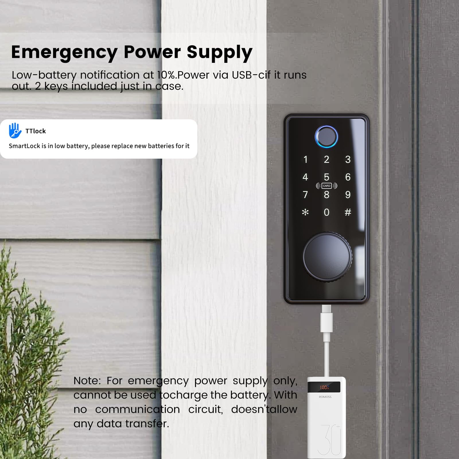 Smart Lock LS-C87, Fingerprint Keyless Entry Door Lock, Built-in Bluetooth, App Remote Control, Front Door Smart Lock Deadbolt, 8-12 Months Battery Life, IP65 Waterproof Multiple Secure Access Options: Unlock your door effortlessly with 5 flexible methods: lightning-fast fingerprint recognition, custom passcodes, reusable key cards, traditional mechanical keys (anti-pick certified), and the TTLock app. Perfect for families, hosts, or caregivers needing shared access – no more hiding spare keys under the mat! Smart Guest Access via App: Securely share access with the TTLock app: create single-use or time-limited passcodes for cleaners, contractors, or visiting relatives. Review real-time entry logs showing who opened the door and when. Bluetooth connectivity ensures instant updates even without Wi-Fi. Low-Power Design with Battery Alerts: Runs on 4 AA batteries (not included) – lasts 10-12 months under normal use. Get app alerts when battery drops to 10%, and use the emergency USB port (for temporary power) or 2 backup keys if batteries die. Note: USB port cannot charge batteries, only provides emergency access. 10-Minute DIY Installation: Fits 95% of standard US doors with just a screwdriver – no drilling or wiring. The color-coded manual guides you step-by-step, and our video tutorials cover tricky edge cases (like metal doors). Lifetime Lock Experts Support: Your security is our priority. Contact us via email 24/7 for instant troubleshooting. Includes free replacement for manufacturing defects.