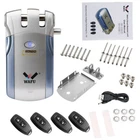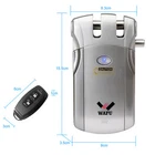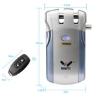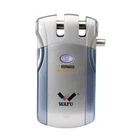 Note: The User Manual is Common Version. This product is 433MHz not 315MHz, and without touch lock/unlock function. Features: *No lock hole design, it completely abandons the traditional key and lock, in the fully opened and closed by remote control, realized the real security. *Tiger lock method, more safe and stable. *No keyholes outside, there is no way for thieves. *Add USB external power source function. Make sure the lock works when battery was dead. ( battery not included ) *Easy installation on all kind of doors, very convenient. Specifications: Brand: WAFU Host Machine: Power Supply: 2*AA batteries ( not included ) Transmission Frequency: 433MHZ(±500KHZ) Operation Range: Within 15m Unlock Mode: Remote control unlock & indoor emergency button unlock Color: Silver / Blue + Silver / Blue+Gold (Optional) Item Size: 15.5*8*3.5cm Item Weight(without accessories): 529g Remote Controller: Power Supply: Lithium button battery Standard Number: 4 (included) Max Controller Number: 16 ( not included ) Function: Lock &unlock Item Size(Each): 6*3*1cm Item Weight(Each): 25g Package Information: Package Size: Approx. 22.2*19.8*5.8 / 8.47*7.8*2.28in Package Weight: Approx. 1040g / 2.3lb Package List: 1 * Lock 1 * Lock Body Holder 1 * Lock Catch 1 * USB Power Cable 4 * Remote Keys 1 * Bag of Mounting Screws 1 * User Manual(English)