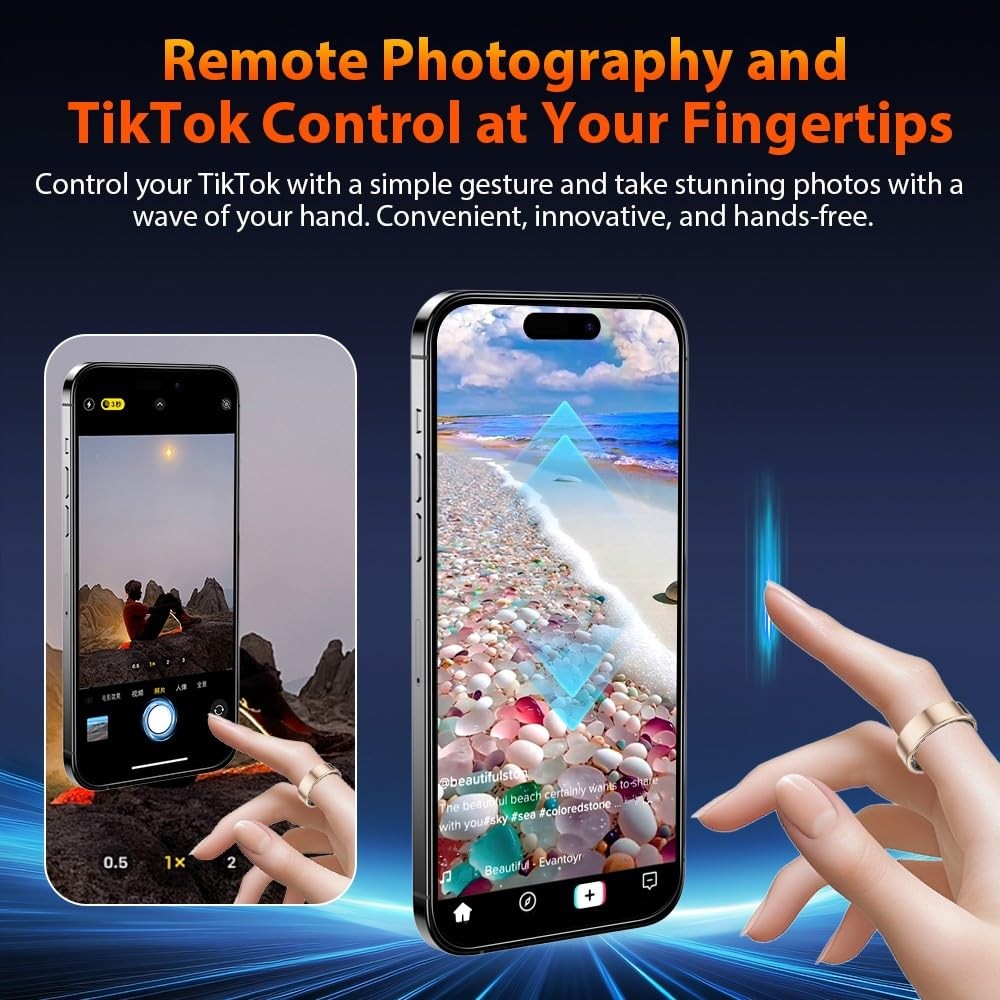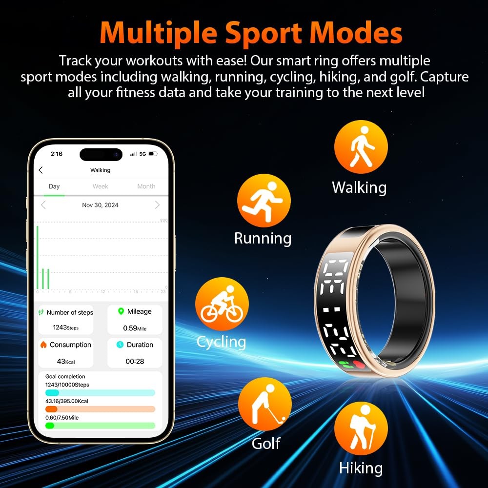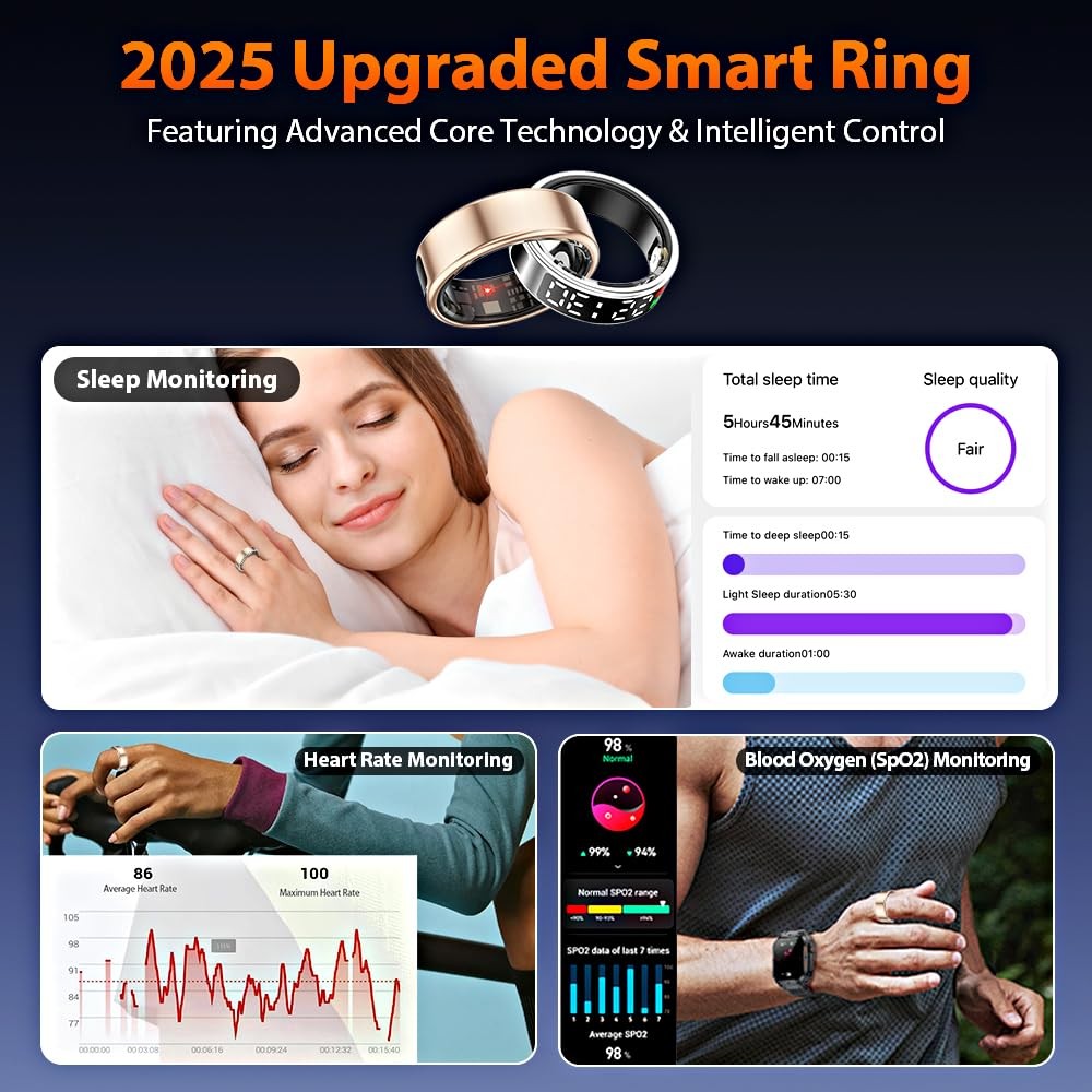 smart ring smart rings for men smart ring for women fitness ring health ring health rings for women smart rings health ring for men smart ring health tracker health rings for men fitness tracker ring sleep tracker fitness rings for women fitness rings for men fitness tracker step tracker smart ring for men sleep ring health ring sleep tracker ring health tracker ring smart rings for women health rings health ring step tracker ring heart rate ring smart ring health tracker for women health tracker smart ring for men heart monitor ring fitness ring best smart ring fitness tracker rings 2025 Upgraded Smart Ring with LED Screen & Touch Button: Experience seamless device management with a high-definition LED screen and intuitive touch control. With a simple tap, you can effortlessly monitor essential data such as time, step count, heart rate, blood oxygen, sleep, and battery—without needing to constantly take out your phone. Designed for ultimate convenience, our smart ring is perfect for work, fitness, and leisure, adding a modern, stylish edge to your daily digital experience. 24-Hour Health Monitoring & Multiple Fitness Tracker: Track heart rate, blood oxygen, and sleep quality with detailed insights via the companion app. Monitor trends in heart rate, blood oxygen levels, and sleep patterns, including duration and stages. It also tracks multiple sports activities such as walking, running, cycling, hiking, and golf, helping you stay on top of your fitness goals. Make data-driven decisions for a healthier lifestyle with this all-in-one wellness tracker. Fashion Smart Ring with Gesture Control for Apps: Enjoy easy control with air gesture functionality. Simply wear the ring and use gestures to browse TikTok, scroll through videos, flip pages in e-books, shop online, browse websites, or capture photos, providing hands-free convenience in daily tasks. Simple to Use with No Subscription Fees: Easily connect your smart ring to iOS 10.0+ or Android 5.0+ devices via Bluetooth for seamless data tracking and app control. No subscription fees required. Once synced, you can conveniently manage and view your data directly from your smartphone. Premium Material & IP68 Waterproof: Crafted from high-quality epoxy resin and stainless steel, this ultra-light 4g smart ring is durable and comfortable to wear. With advanced sealing technology and an IP68 waterproof rating, it withstands water immersion, making it ideal for daily activities like hand washing, workouts, and even diving or snorkeling. Built for durability, its robust construction ensures long-lasting performance.