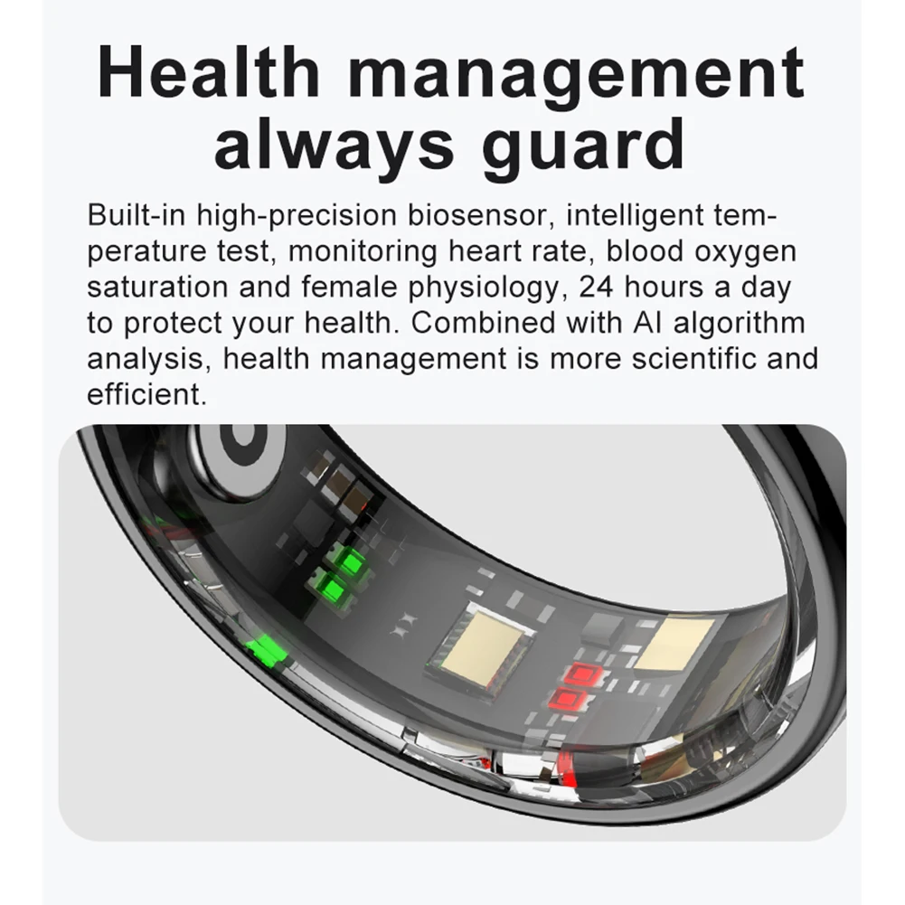 Smart Ring R08 Womens Men Electronic Smartring 5ATM Waterproof Blood Oxygen Pressure Health Monitor With Charging Case Health and Sleep Monitor for Xiaomi Samsung Phone Feature: 1.Daily Activity Tracking: Monitor your steps, distance, and calories burned effortlessly with this state-of-the-art Womens Men Electronic Smartring. Stay on top of your fitness goals and maintain an active lifestyle. 2.Comprehensive Health Monitoring: With its built-in Blood Oxygen Pressure Health Monitor, the device provides real-time insights into heart rate, blood oxygen, HRV, and skin temperature, ensuring optimal Health and Sleep Monitor capabilities. 3.Intuitive Indicators: The smart device features vivid indicator lights for message notifications and charging status, enhancing user interaction while ensuring you're always connected. 4.Touch-Sensitive Controls: Easily manage music, control short videos, and provide quick feedback with the intuitive touch interface, offering seamless control over your digital experience. 5.Additional Features for Sports Enthusiasts: Capture photos remotely, receive female health reminders, and enjoy versatile Sports Fitness Tracker modes tailored to different workout routines. Specification: Origin: Mainland China Ring size inner diameter (mm): 12 (inner diameter 21.6mm)7 (inner diameter 17.9mm), 8 (inner diameter 18.3mm), 9 (inner diameter 19.2mm), 10 (inner diameter 20mm), 11 (inner diameter 20.9mm), 12 (inner diameter 21.6mm), Model: R08 Chipset Supplier: Realtek Chipset: RTL8762 ESF APP: QRing Compatible System: for Android 5.1 (inclusive) and above, for IOS 8.0 (inclusive) and above FLASH memory: RAM 104KB FLASH 512KB Touch: Supported BT: 5.2 low-power Bluetooth-Compatible chip Battery type: polymer lithium ion Capacity: 15mAh (18mAh for No. 10 and above) Waterproof level: 5ATM Ring charging time: time): about 1.5 hours Life time: 5-7 days in use, 15 days on standby Appearance material: stainless steel Packaging size: 75*75*43mm Gross weight: 98g APP software functions: 1. Step count, sleep, heart rate, exercise data recording 2. Health monitoring, pressure, blood oxygen measurement 3. Multiple sports modes, photo taking, message reminders 4. Supported languages: Danish, Ukrainian, Russian, Croatian, Hungarian, Hindi, Indonesian, Turkish, Hebrew, Greek, German, Italian, Latvian, Czech, Slovak, Slovenian, Japanese, French, Polish, Thai, Estonian, Swedish, Lithuanian, Simplified Chinese, Traditional Chinese, Romanian, English, Dutch, Portuguese, Spanish, Vietnamese, Arabic, Korean, Malay Note: Due to different monitor settings and lighting conditions, the actual color of the item may vary slightly from the pictures. Thanks for your understanding! Please allow a 1-2 cm difference in measurements due to manual measuring. 1 X Smart Ring 1 X Charging Case 1 X Charging Cable 1 X Instruction Manual