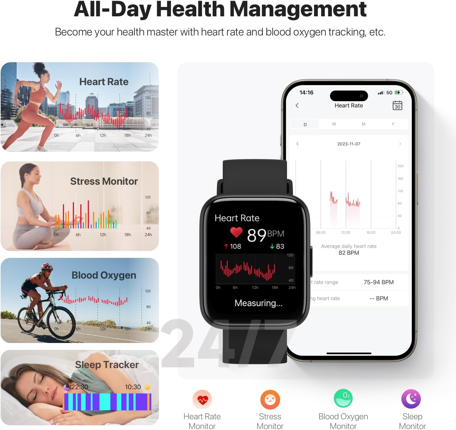 CLEAR & STEADY BLUETOOTH CALLS — Intelligent noise-canceling smartwatch algorithms allow you to make clear and audible calls, eliminating background noise. Because the Ultra Seamless Bluetooth v5.3 talk chip provides a single, reliable connection, it reduces battery consumption and long standby time, keeps you permanently connected to the outside world, and provides a greater range of connectivity. SMART NOTIFICATION & QUICK REPLY — Receive gentle vibrations on your wrist for incoming messages, calls, and alerts. The smart watch for Android phones lets you send preset quick replies to calls and messages at any time(quick reply is available for Android users only), which you can stay connected without even having to take your phone out of your pocket. AI VOICE ASSISTANT & IP68 Waterproof— Talk to the AI voice assistant for perfect hands freedom navigation, calls, music and alarms. With an IP68 waterproof,designed for your active lifestyle, the smartwatch is easy andperfect for Daily Waterproofing needs. LARGER 1.83" DISPLAY & DIY WATCHFACES — The 1.83 inch TFT LCD display is bright at 550 nits and has a high screen-to-body ratio, allowing you to view your daily data clearly in the brightest sunlight. You can choose from over 150 designs watch faces of smart watch for men and women or customize your favorite image as a dial to match your daily mood. 24/7 ACTIVITY TRACKER — Equipped with a Heart Rate Monitor, Blood Oxygen Monitor, and a Stress Monitor to keep an eye on your health around the clock. It also monitors your sleep stages, so you can clearly know the quality of sleep during REM, core sleep or deep sleep. It also synchronizes with a woman's menstrual cycle to provide predictions and reminders. OVER 100 SPORTS MODES & ANYTIME RECORD — Stay on top of your fitness tracker with our extensive range of sports modes, including cycling, walking, running, football, strength training, yoga, cricket and more! Track your heart rate zones, steps, distance, calories and more. In addition, track your sport and automatically recognize suitable workout modes. WIDELY COMPATIBLE — Compatible with Android 6.0 and iOS 10.0 or above, including Apple iPhone, Samsung, and LG etc, this watch pairs effortlessly with the "Halofit" APP, keeping you connected and informed on the go with the digital sport watch. REMARKABLE DURABILITY — Equipped with a powerful 300mAh battery and energy-efficient Bluetooth v5.3 chip, this watch delivers 10 days of typical use, long standby time of 30 days, and 3 days of Bluetooth Calling. Whether you're conquering workouts, exploring the outdoors, or simply staying connected, this smartwatch won't let you down. MULTIFUNCTIONAL SMARTWATCH for Men Women— The fitness watch has a variety of daily tools, such as Auto Activity, Music Control, Find My Phone, Sedentary Reminder, Rehydration Reminder, which can meet all your daily activities, convenient and practical. GENUINE AFTER-SALES SERVICE — JeeJTek Smart Watch offers a 12-month waranty, supporting refud or replacement for your no stress purchase. Your satisfaction is our goal. If you have any questions or more suggestions about our smart watches, please contact us without any hesitation. Product Description The product arrived wet and unavailable. Our products are well packaged, if you receive a wet product, it is most likely caused by Amazon's shipping, please find Amazon for help. The watch cannot be set to English language. Press the watch right button > slide down to the bottom and find settings icon > find out the language icon > choose English and tap ”√“ to confirm. Won't pair with Android phone/iOS phone/ The qr code doesn't work/App doesn’t work. You can firstly simply re-upgrade the application to the latest version. If it still doesn't work, please contact our after-sales service, ready to help you solve the problem perfectly. Used for a few days, the watch screen wouldn't turn on. This is due to a bug in the watch that needs to be resolved with an OTA upgrade. The steps are as follows: Open HaloFit APP > Device > Device Settings > OTA Upgrade.