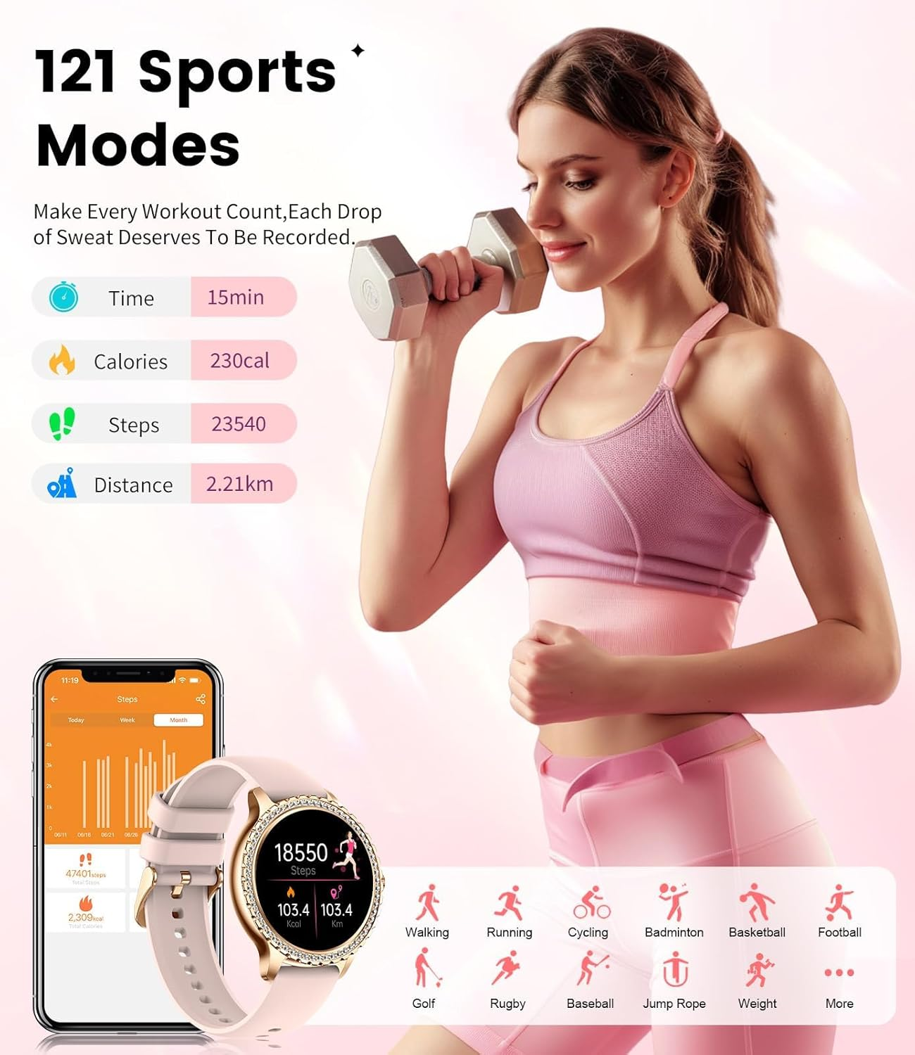 【Elegant Smart Watch for Women】Experience crystal-clear visuals on the 1.32" HD touch screen with 360*360 HD resolution. The bezel and straps are adorned with shiny diamonds, adding an elegant and luxurious touch that is sure to turn heads. Customize watch faces and straps to complement any outfit and showcase your individuality effortlessly. Elevate your style with this chic accessory - the perfect ladies' smart watch. 【Stay Connected & Informed, Hands-Free】Our women's smart watch offers Bluetooth calling with a built-in microphone and high-fidelity speaker. Connect effortlessly to your phone and handle calls directly from your wrist - receive, reject, or answer with ease. Stay updated with SMS and messages from popular social media platforms like WhatsApp, Facebook, Instagram and more. And during your workouts, you no longer need to take out your phone to check messages.Never miss a vital message again! 【100+ Sport Modes & IP67 Waterproof】This fitness tracker watch supports for 20 sports modes, including walking, running, cycling, yoga, tennis and so on.Easily track steps, distance, calories, and heart rate on the women's smartwatch or the "FitCloudPro" app. Scientific and safe training awaits you. IP67 waterproof rating ensures daily needs, but avoid prolonged soaking. 【Your All-Day Health Companion】High-performance optical sensors continuously track your heart rate, blood oxygen levels, and sleep quality, providing detailed data-based presentations for insightful analysis. Access your health information conveniently via the "Fitcloudpro" app, gaining a better understanding of your overall wellness. (NOTE: The measurement data is for reference only and not intended for medical monitoring.) 【Empowering Women's Health】Our ladies' smart watch features a built-in physiological cycle reminder, keeping you informed about menstrual and ovulation periods. Stay prepared as it predicts and reminds you of your next period, allowing better planning. Even during pregnancy, stay connected to your body with pregnancy tracking. 【Versatile & Compatible】Discover the countless practical features of our women's smart watch compatible with Android and iOS phones! Enjoy AI voice and Bluetooth calling along with a women's health pedometer, calorie tracker, sedentary reminder, water reminder, alarm clock, weather display, multi-language support, message push, and comprehensive health tracking. With wide compatibility, this smartwatch pairs seamlessly with most iOS 8.4 and Android 4.4 or above smartphones. 【After-Sales Service】We stand behind the quality of our products and offer a 12-month worry-free product warranty, which includes replacement, return, or accessory replacement services. You can purchase our smartwatch with confidence, knowing that we have you covered. If you have any questions or concerns about your smartwatch, please do not hesitate to contact us. Our team is always ready to provide you with the support you need. Product Description 2024 Shinny Smart Watches for Women The unique dial design is adorned with exquisite diamonds, adding a touch of luxury to your wrist. Fashion and extravagance blend seamlessly, making a perfect fusion. With every raise of your hand, you will be captivated by the sparkling diamonds on the dial. Whether it's a gala, a social gathering, or your everyday attire, this ladies smart watch will become your fashion focal point, emanating a distinct charm. Compatibility: Smart watch Android 4.4+/iOS 8.4+/Bluetooth 5.0 System Smartphone. It's a wonderful gift for mothers day gifts,teacher appreciation gifts,mothers day gifts from daughter,birthday gift,graduation gifts... Smart Watch with Bluetooth Calls&Message Push Bluetooth Call The smart watch for women comes with built-in calling functionality, eliminating the need to frequently retrieve your phone from your pocket or bag to answer calls. Whether you're exercising, driving, working, or in other scenarios, a simple tap on the smartwatch screen or button allows you to answer important calls and maintain conversations. Additionally, the smartwatch offers you the option to reject incoming calls, enabling you to easily block disturbances during times when concentration and tranquility are needed, enhancing convenience and comfort in your daily life. Smart Notification The smartwatch will vibrate to remind you when your phone receives the messages or App notifications (Facebook, WhatsApp, Twitter, Instagram, etc) you won't miss any important information Fitness Tracker Watch 20+ Sports Modes and All-Day Activity Tracking There are more than 20 sports modes tracking available in the fitness tracker, covering almost all daily sports activities, the all-day activity tracking feature monitors your steps, distance, and calories burned all the day, so you can see how much progress you've made towards your fitness goals. IP67 Waterproof IP67 waterproof rating can offer protection against life's splashes and spills.Note:Do not use in water above 38 ° C, such as showers, saunas, etc. and do not use the Seawater Health Tracker Women's Menstrual Cycle Reminder C aring for women’s health, ladies digital watch have three reminder modes: menstrual management, pregnancy preparation and health of both sexes. The mobile phone records the historical menstrual period and the watch displays the current physiological state (menstrual period, predicted menstrual period, ovulation period), and takes good care of your health. 24/7 Heart Rate Monitoring Stay on top of your health with our smart watches for women both Android and iOS phones. Enjoy continuous heart rate tracking to gain valuable insights into your well-being. Blood Oxygen Level Tracking Our fitness smart watches for women, designed for women, offer the capability to monitor your blood oxygen levels. Easily visualize and analyze your blood oxygen data, including average, maximum, and minimum readings, right in the app for a comprehensive understanding 
