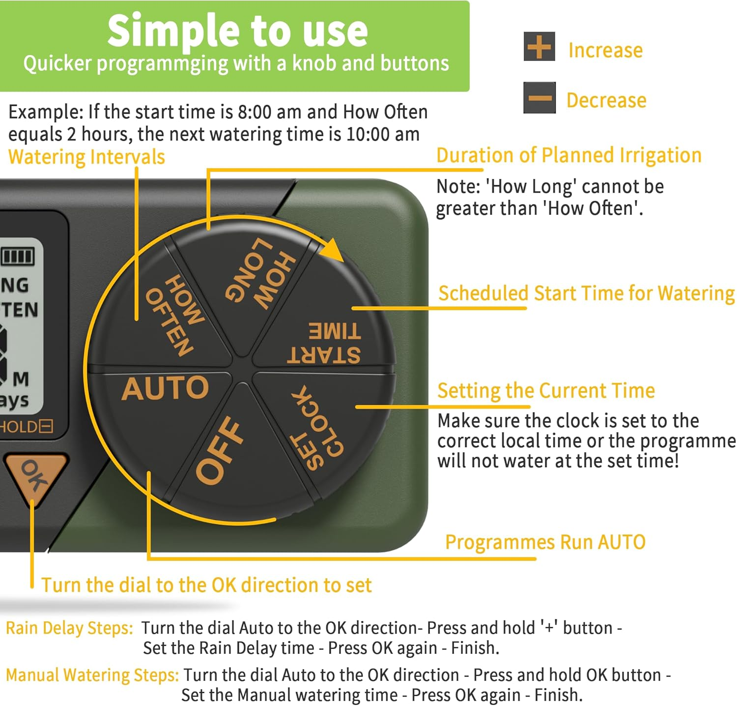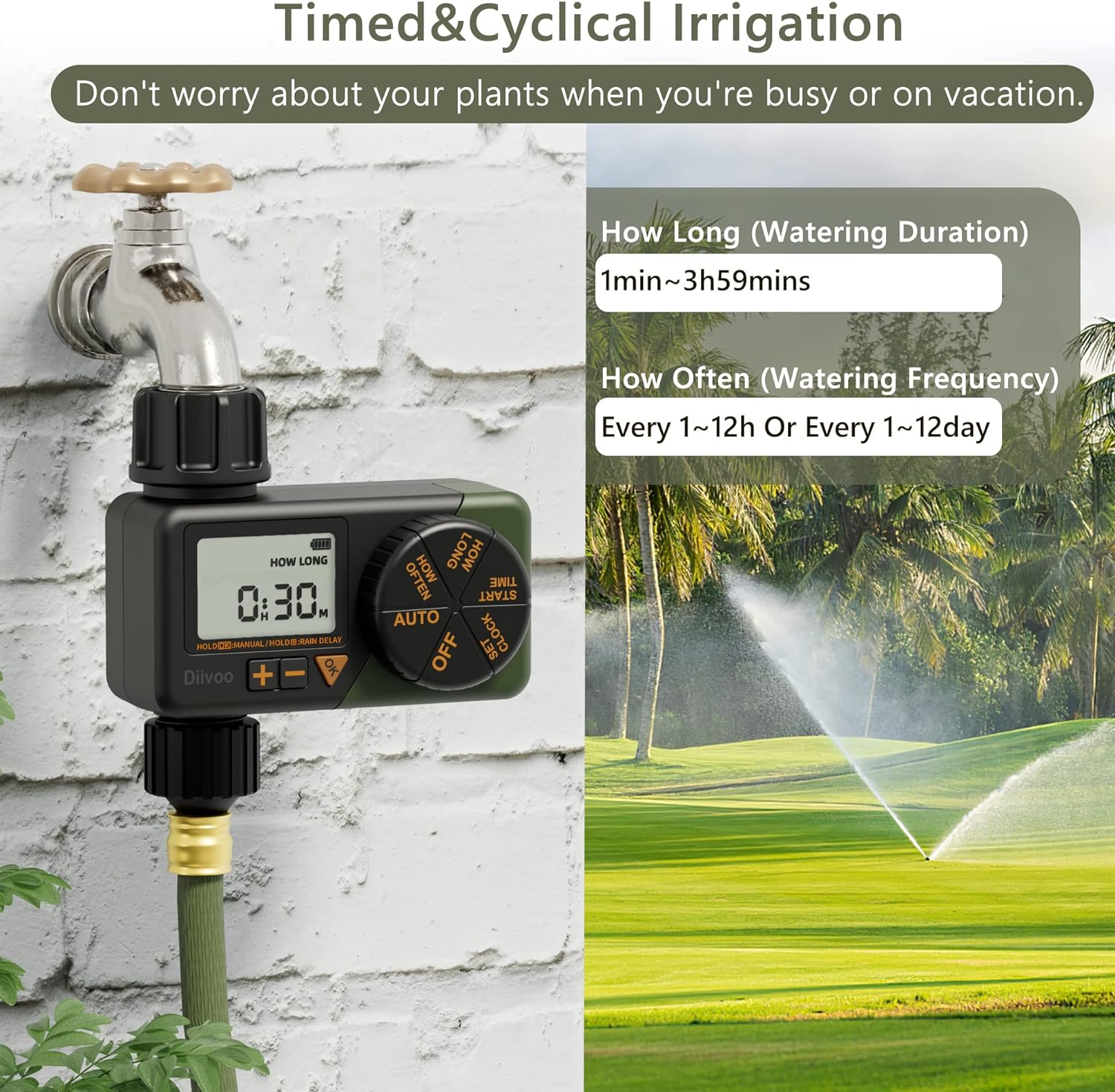 Timed and periodic irrigation: Diivoo Water Timer allows you to irrigate on specific days. You can set the start time, watering duration (from 1 minute to 3 hours 59 minutes), and watering frequency (from hourly to every 12 hours, including only even days or only odd days). Diivoo Sprinkler Timer provides more precise control for your variable irrigation needs Simple and Flexible Programming: If your local climate is arid, you can set multiple watering times for your garden, lawn, or other areas within a day. Conversely, if you only need to water once a day or every other day, you can use the “How Often” button to adjust the watering frequency to suit that schedule. You’ll have full control, so you can stop worrying about your plants drying out Manual Watering Mode: Hose timer enables you to manually water from 1 minute to 8 hours without interrupting your current watering program. It’s ideal for use in gardens, flowerbeds, lawns, patios, greenhouses, fountains, farms and more Water Conservation: By using the rain delay mode, you can put your regular watering schedule on hold for 24, 48 or 72 hours, after which it will resume automatically. The equipment has a waterproof and leak-proof rating of IP54, making it ideal for lawn sprinkler controllers, greenhouse mist systems, pool filling, water for pets, etc Easy to Use: The automatic watering timer is equipped with three buttons, a rotary dial and an LCD screen, making it easier for you to set and check the watering schedule than with the button-only version. It has a 360° rotatable water inlet fitting, which you can thread to accommodate any standard ¾" or ½" garden hose Product Description The video showcases the product in use. The video guides you through product setup. The video compares multiple products. The video shows the product being unpacked. Rain delay If rain is in the forecast or if the ground is already sufficiently wet. Rain delay feature enables you to postpone watering for 24, 48 or 72 hours. Manual watering steps Turn the dial Auto to the OK direction - Press and hold OK button - Hand icon appears - Set the Manual watering time - Press OK again - Finish. Waterproof battery compartment Powered by two 1.5 V AA batteries (not included), the equipment features a leak-proof design with an internal rubber ring around the case cover. Power indicator Smart power indicator will remind you to replace the batteries before they run out. If battery power is low, the timer will shut off automatically. The LCD screen does not display anything Make sure the batteries are properly placed in the battery box Water does not come out Check if: 1. The programs are set up correctly 2. The batteries are low 3. The Faucet is turned off 4. Rain delay is turned off The hose tap connection/outlet leaks (If necessary, please use an appropriate adapter or PTFE tape) Check if: The O-ring is connected correctly to the hose tap The connection outlet or water pipe is broken The Sealer is missing or if it is tightly installed The faucet and water pipe has a different thread Is it compatible with water bucket or drip system? No, because the water pressure of water bucket and drip system does not meet the pressure standard for water valve Tips : Only supports 4*AA 1.5 alkaline batteries (excluded), with a normal service life of 6 to 8 months. Note that the following conditions may cause the battery to drain too quickly, thereby reducing the service life of the device: 1.Setting watering times too often can drain power faster. 2. Using rechargeable batteries or carbon batteries will cause excessive power consumption.
