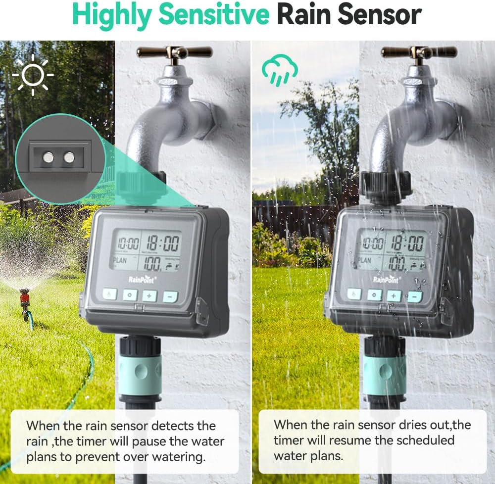 AUTOMATIC SPRINKLER TIMER WITH PROTECTED LCD SCREEN: Our sprinkler timer offers easy control over your watering with a garden hose timer featuring a protected LCD screen for quick programming. Designed for any watering timer, it integrates into your irrigation system for garden, keeping your water system for garden efficient. Ideal for hose timers for watering, ensuring plants get the right hydration on schedule. RAIN DELAY SENSOR FOR SMART WATER SAVINGS: Our water hose timer outdoor features a rain delay sensor, preventing overwatering by pausing watering during rainfall. This smart feature enhances your automatic watering system, optimizing your sprinkler timer for garden hose for better efficiency. Ideal for any garden irrigation system, water timers for hoses programmable, or garden timers for watering, ensuring healthy plants. CHILD LOCK TO PREVENT ACCIDENTAL CHANGES: This hose timers for watering include a child lock, keeping settings secure and preventing unwanted disruptions. This garden timer maintains a steady schedule, working seamlessly with any automatic garden watering system. Whether using a garden hose timer, water sprinkler timer, or irrigation system for garden, this feature ensures worry-free watering with your irrigation timer outdoor setup. WEATHER-RESISTANT DESIGN FOR OUTDOOR USE: Our smart sprinkler timer features a protective cover, shielding it from harsh weather while keeping the water timer for garden hose functional. Designed for any garden timers for watering, this water timers for hoses programmable model ensures continuous irrigation. Ideal for a sprinkler system, garden irrigation system, or water system for garden, providing long-term performance. LOW BATTERY ALERT FOR UNINTERRUPTED WATERING: This automatic sprinkler timer includes a low battery alert, ensuring your smart hose timer never stops unexpectedly. Designed to work with any faucet timer, it keeps your water sprinkler timer, irrigation timer outdoor, and hose timers for watering running smoothly. Ideal for a water hose timer outdoor, ensuring your water timers for hoses programmable work seamlessly. Product Description