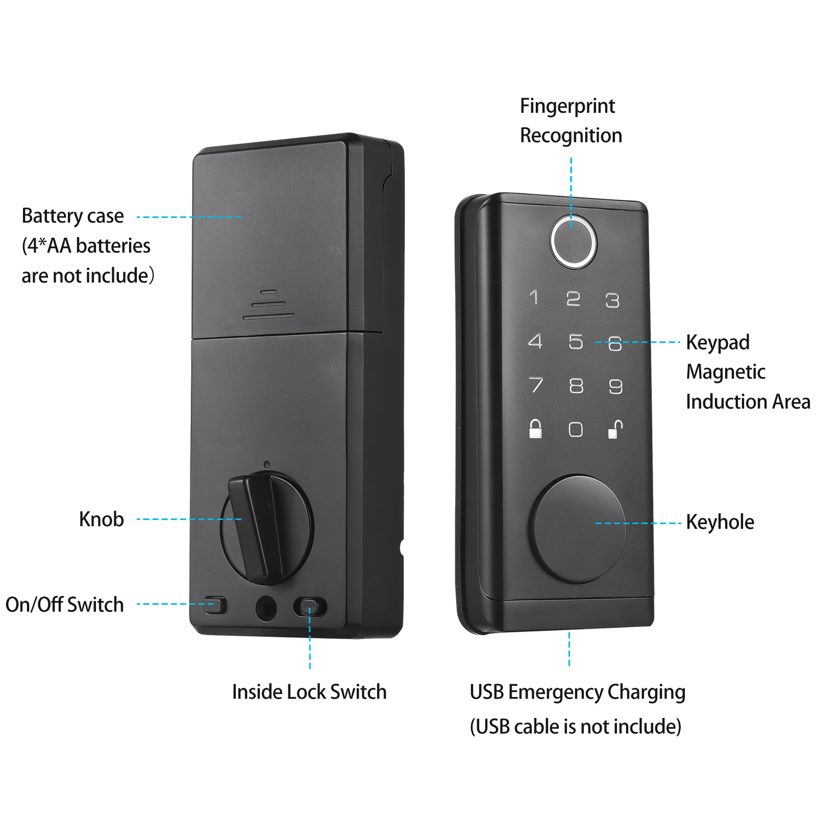 Keyless entry door lock with built-in Wi-Fi allows fingerprint, smartphone APP, digital code, IC card and keys to enter. Allows to create and manage up to 150 access codes and 100 access fingerprints, and temporary access for visitors. Built-in alarm technology low battery warning. Zinc alloy anti-pry lock body, suitable for door thickness from 1-3/8 inch (35 mm) to 1-31/32 inch (50 mm). Features: 【Smart Lock with 5 Entry Method】 Keyless entry door lock with built-in Wi-Fi allows fingerprint, smartphone APP, digital code, IC card and keys to enter. Convenient APP remote control and more secure biometric fingerprint recognition. 【Support Temporary, Multi-person and Multi-scenario Use】 Smart door lock allows to create and manage up to 150 access codes and 100 access fingerprints, and temporary access for visitors. Widely used for home entry door, hotel, office, ect. 【Safety Alarm】 Electronic door lock built-in alarm technology. It will alarm if anyboby enter the wrong password multiple times. Support Battery operated and USB emergency charging, while the low battery indicator offers advanced warning for battery replacement. 【Anti-theft Security Deadbolt Lock】 Security door locks with strengthened and thickened zinc alloy anti-pry lock body, no fear of violent lock collision and lock picking, anti-peeping user code protection, locked automatically when close the door, effective home protection and anti-theft. 【Easy to Install with Complete Accessories】 Keypad door lock with handle set are easy to install with full accessories,you just need to prepare a screwdriver and 4*AA batteries(package not include). Suitable for door thickness from 1-3/8 inch (35 mm) to 1-31/32 inch (50 mm). Specifications: Material: ABS + zinc alloy Product color: Black Waterproof: IP67 Fingerprint recognition: ≤0.5s False recognition rate: ≤0.001% True rejection rate: ≤0.01% Fingerprint storage: 100 sets Code storage: 150 sets Unlock method: Fingerprint, code, BT, card, key Charging method: 4*AA battery(not include) Package Size: 39 * 26.3 * 9cm / 15.3 * 10.3 * 3.5in Package Weight: 2.06kg / 4.5lbs Packing List: HB0234 1 * Front lock 1 * Rear lock 1 * Front door handle 1 * Rear door handle 2 * keys 3 * Cards 1 * Installation tool set 1 * Instructions 1 * Installation size card