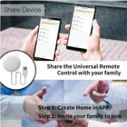 Tips for purchase 1. The intelligent remote control only supports infrared remote control, and DO NOT support Bluetooth or RF or 2.4G remote control 2. It does not have a built-in battery and requires constant USB power supply. 3. It needs WiFi 2.4GHz network that is always connected when it works. Please turn on 2.4GHz WiFi and stay online. 4. The APP is Smart Life and Tuya Smart, and the third party (Amazon Alexa, Google Home, Yandex Alice) is not necessary. 5. Because the third party (Amazon Alexa/Google Home/Yandex Alice) does not have a corresponding display panel, after linking, they cannot display the same control panel as Smart Life. 6. The remote control can be controlled by voice on the third-party smart speaker (Amazon Alexa/Google Home/Yandex Alice), But DIY learning control panel does not support it. 7. It cannot reverse synchronize the signal of the original remote control of household appliances. 8. Yandex Alice only supports AC, TV, TV Box and Fan. 9. Bluetooth only works when configuring. 10. Not individually packaged, There are two products in one package. Product Features: With The Smart Universal IR Remote Control, you may use your smart phone to control home appliances, such as STB(Set-Top-Box), TV Box, TV, Air Conditioner, Fan, DVD, etc. Compatible with most of brands, for details, please refer to the supported brand list in App. Besides, it has LEARNING FUNCTON, allows you to copy the key function of original remote control to App. Note: Not compatible with the home appliances which use RF or BLUETOOTH remote control. 1. Massive IR Code Database Support 4000+ brands, 50000+ IR Code on cloud, supported devices library is constantly being updated by the cloud. 2. App Remote Control Remote Control your home appliances by using "Smart Life" App in your smart phone anywhere anytime. For example: Switch on home A/C in advance, enjoying the comfortable temperature once you get home. 3. Easy to install and add to APP Once you plug the cable line into the device, then select the app's auto find Smart IR Remote Control. The whole process takes only a few minutes. 4. Voice Control By connecting Intelligent speaker, such as Amazon Alexa, Google Home, Yandex Alice, you can control your home appliances by voice. For example: Alexa, turn on TV; OK Google, set air conditioning temperature to 25 degrees. 5. Scenario and Automation in App A scenario consists of 1 or more actions. By creating an "Scenario", you may control multiple devices with one tap; By adding an "Automation" and interworking with other smart home devices, Wi-Fi remote control is able to execute actions automatically according to conditions, such as device status, weather and time. 6. Timer and Automatic Trigger According to your living habits, set time switches for your home appliances, such as turning on/off the air conditioner at regular intervals. The APP have 7 day Scheduling programming 7. DIY Customizing button and Copy function in the "Smart Life" App, if your home appliances brand is not in the list or not supported. 8. Third-Party Control Works with Amazon Alexa, Google Assistant, Siri(iOS 12.0 or later), Tmall Genie, Tecent Xiaowei, DingDong, Rokid, DuerOS, etc.. App Remote Control After the configuration is complete, you can control the TV, air conditioner at home whether you are working or traveling. Tips: 1. The native APP of The Smart Universal IR Remote is called "Smart Life". 2. And it not support MiHome,EWelink,and other APP. 3. Its remote control function needs to use WiFi all the time IR Remote Replace The Smart IR Remote expanded IR code library cover above 98% IR device. So TV, Air conditioner, STB Fan and lighting etc. which used IR Control can be control by it. You don't need to worry about the problems you can't control, and finally we provide the copy function. Works with Amazon Alexa, Google Assistant, Yandex Alice By link to Amazon Alexa, Google Home, Yandex Alice account, you can control your home appliances by voice. For example: -Alexa, turn on the TV; -OK Google, set air conditioning temperature to 25 degrees. -Alice, turn on the light. NOTE: Yandex Alice Only Support Air conditioner, TV, TV BOx STB, Fan Timer and Automatic Trigger Never miss one second of excellent match -Stay up late for the match,but always oversleep? -The smart remote control helps you turn on TV at right time and right channel. Enjoy your match! IR Learning And Copy Function: Smart Life App provides Customizing and copy function. If your home appliances is not in the brand list or not supported, you may use this function to copy the key function of original remote control to App What's IR Remote Supported? The Smart IR Remote supports all infrared remotes. But note that 2.4G remotes, RF remotes, and Bluetooth remotes are not supported. Tips: 1. The infrared remote control has an infrared emitting tube, or the infrared emitting tube is protected by a black transparent window. 2. Long press the infrared remote control to start the home appliance, the long press function is not supported, other functions are supported. Product Parameter: Input: DC 5V/1A(NO Adapter) Connection: Wi-Fi IEEE 802.11 b/g/n 2.4GHz App: Smart Life Voice Control Support: Amazon Alexa, Google Home, Yandex Alice What's in the package? 1. Smart universal IR remote control*2 2 User Manual*1 What is APP look like? The APP page may be modified better Perhaps you need more Infrared rays cannot penetrate the wall, so it cannot control household appliances in other rooms. It is recommended to install a universal remote control in every room.