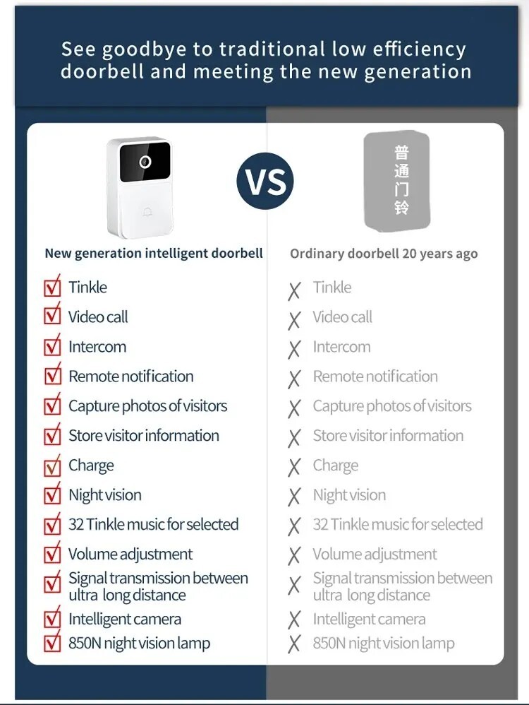 Product Description Features: 1.Wireless Connection :No need for complicated wiring, the doorbell connects wirelessly to your home network. 2.Night Vision :With high-quality night vision technology, the doorbell can capture clear footage even in low light conditions. 3.Two-Way Intercom :The doorbell comes with a built-in intercom system that allows you to communicate with visitors before opening the door. 4.Voice Change :The doorbell has a voice change feature that allows you to customize the doorbell's greeting message. 5.Video Call:Easy to deal with visiting guests, when someone press the doorbell, the doorbell will push the nitifications to the phone, the owner can enter the phone video conversation interface. Support 2.4GHz WIFI and APP connection, 480P high resolution, present you clearly pictures and video. 6.Two Way Audio:Built in mic, you can see and talk to your visitor at any time and anywhere when pressed the Doorbell. 7.Long Standby:Built in high capacity battery, long standby, don't need charge it frequently. The battery is rechargeable battery, when the battery is no power, can charge it again and again 8.Portable Installation:Can be pasted and perforated. Support adhesive backing, don't need punch holes, while support hole punch installation. No plugging, convenient and hassle-free. 9.Capture picture:Storage to the cloud, security protection drip. When a visitor press the doorbell, it can capture the visitor's picture and save the record to the cloud, so the phone app can view the past pictures at any time, which is safer and more secure 10.Night Vision:Build in the IR LED light, the picture is clear in the day and at night. Also can automatically switch to night mode from day mode after the ambientlight drops down to 2 Lux. Specifications: Intercom: Yes Connection Type: WireLess Item type: VIDEO DOORBELL Packaging includes: 1 Pack Visual doorbell Payment Returns Contact Us Shipping Feedback 1. We only accept eBay payments. 2. All payments must be made within 3 days after auction won. Item may be returned for refund or replacement within 30 days of the purchase date. Returned merchandise must be unused, in original packaging and include all accessories. Shipping costs are non-refundable. Please do not hesitate to leave us your 5 Star ★★★★★ of DSR positive feedback if you are satisfaction with our products ,delivery or services . If you have Any Questions Or Unsatisfied with your purchase, please Email us firstly to get a better solution before you leave a neutral or negative feedback, we work hard to make sure every customer 100% satisfied and resolve anyproblem for you. Please email us first in the following situations: 1.The item can't work properly. 2.The item broken on the post. 3.You bought or received the wrong items. 4.You have not received your shipment within the period. 5.Before you give us Negative feedback. 6.Before you open a case/return on eBay. All questions will be replied within 24 hours (Except Saturday and Sunday or holidays). Thank you for your kindness! 1. eBay Payments Confirmed Addresses Only. 2. No Delivery to Alaska and Hawaii or PR. 3. No P.O. Box and APO/FPO Delivery. 4. Tracking Number will be provided. 5. Domestic shipping is within the 48 Contiguous States of United States, the delivery time is between 2 and 8 days. Items will be shipped by UPS, USPS or Fedex within 3 business day after receiving full payment. 6. International shipping is from China, the delivery time is between 10 and 30 working days. As a seller , Positive Feedback is very important to us. We try our best to let our customers to be happy. If you have any question about your order, please contact us ,please let us know before you Leave the Negative feedback ,We are willing to do our best to make up for it, Thank you very much ! Payment 1. We only accept eBay payments. 2. All payments must be made within 3 days after auction won. Returns Item may be returned for refund or replacement within 30 days of the purchase date. Returned merchandise must be unused, in original packaging and include all accessories. Shipping costs are non-refundable. Please do not hesitate to leave us your 5 Star ★★★★★ of DSR positive feedback if you are satisfaction with our products ,delivery or services . Contact Us If you have Any Questions Or Unsatisfied with your purchase, please Email us firstly to get a better solution before you leave a neutral or negative feedback, we work hard to make sure every customer 100% satisfied and resolve anyproblem for you. Please email us first in the following situations: 1.The item can't work properly. 2.The item broken on the post. 3.You bought or received the wrong items. 4.You have not received your shipment within the period. 5.Before you give us Negative feedback. 6.Before you open a case/return on eBay. All questions will be replied within 24 hours (Except Saturday and Sunday or holidays). Thank you for your kindness! Shipping 1. eBay Payments Confirmed Addresses Only. 2. No Delivery to Alaska and Hawaii or PR. 3. No P.O. Box and APO/FPO Delivery. 4. Tracking Number will be provided. 5. Domestic shipping is within the 48 Contiguous States of United States, the delivery time is between 2 and 8 days. Items will be shipped by UPS, USPS or Fedex within 3 business day after receiving full payment. 6. International shipping is from China, the delivery time is between 10 and 30 working days. Feedback As a seller , Positive Feedback is very important to us. We try our best to let our customers to be happy. If you have any question about your order, please contact us ,please let us know before you Leave the Negative feedback ,We are willing to do our best to make up for it, Thank you very much ! powered by