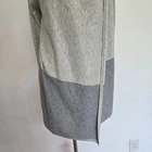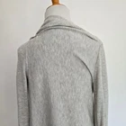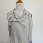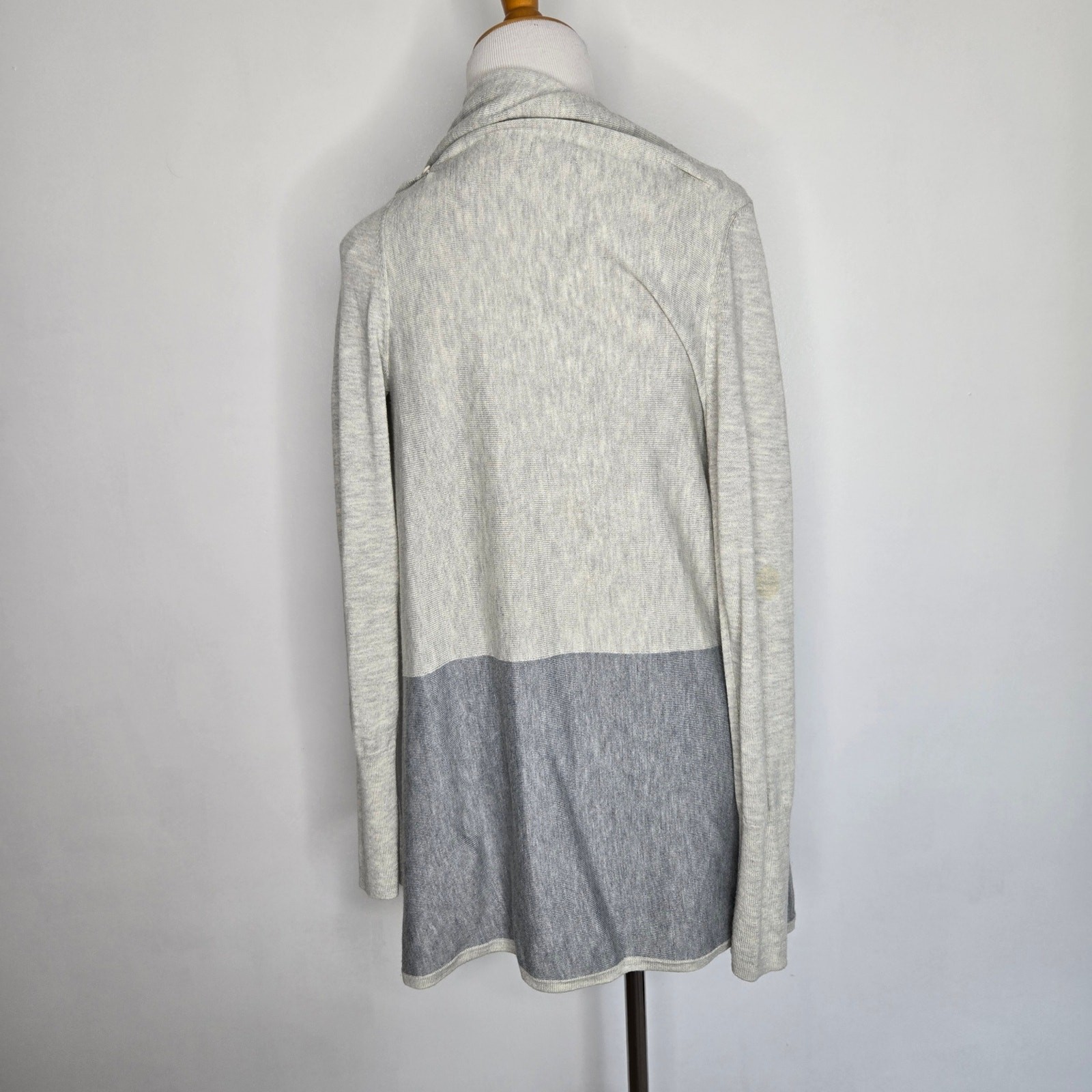 Smartwool Edgewood wrap sweater Size small 55% polyester/30% wool/15% nylon Machine wash Full wrap styling with buttons on each shoulder to fasten Long sleeves Cowl neck when fastened Colorblock light/darker gray Soft and lightweight No pockets Longer length Ribbed trim Approx. lay-flat measurements: Length back: ~27" Sleeves: ~26" Last photo shows faint but sizable stain near elbow. Otherwise in excellent pre-owned condition.