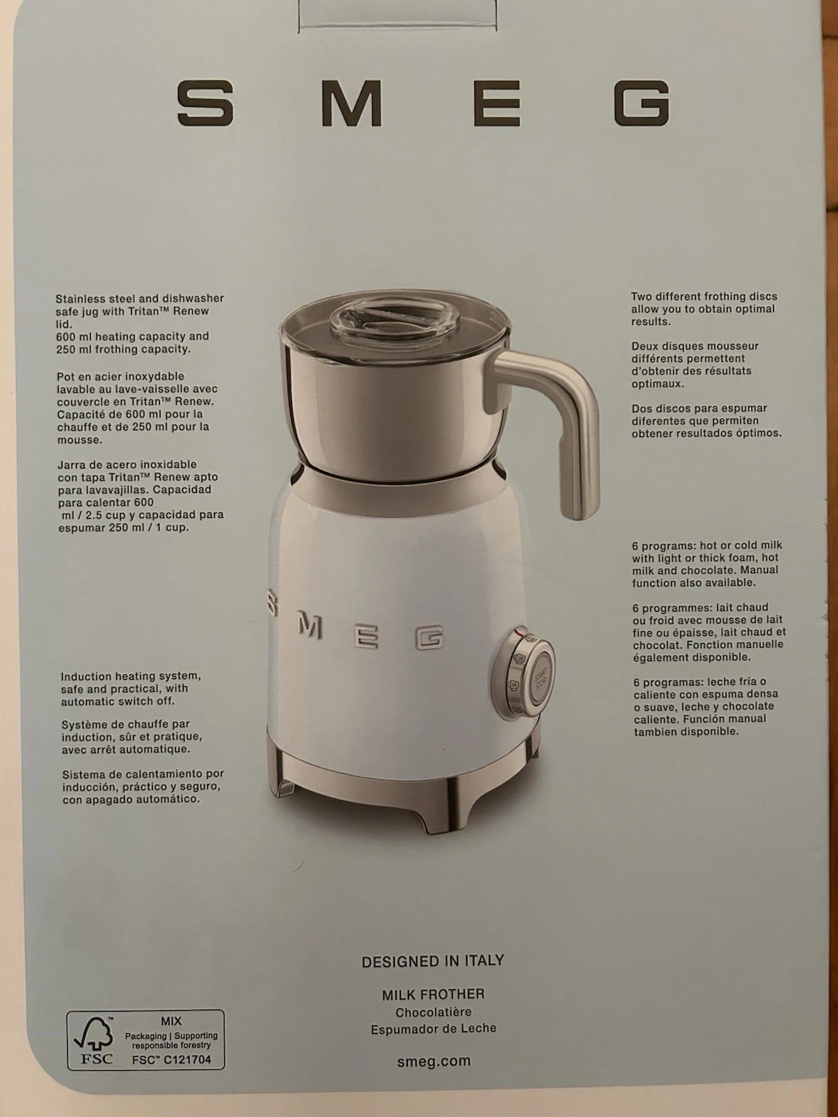 The Smeg Retro 50's Style Milk Frother in red (model MFF 01) is a stylish and functional addition to any kitchen. This new, boxed milk frother from the renowned brand SMEG not only froths milk for coffee or tea but also adds a touch of retro charm to your countertop. Its vibrant red color and sleek design make it a standout piece that is both practical and aesthetically pleasing. Perfect for those who appreciate vintage aesthetics and quality kitchen appliances.