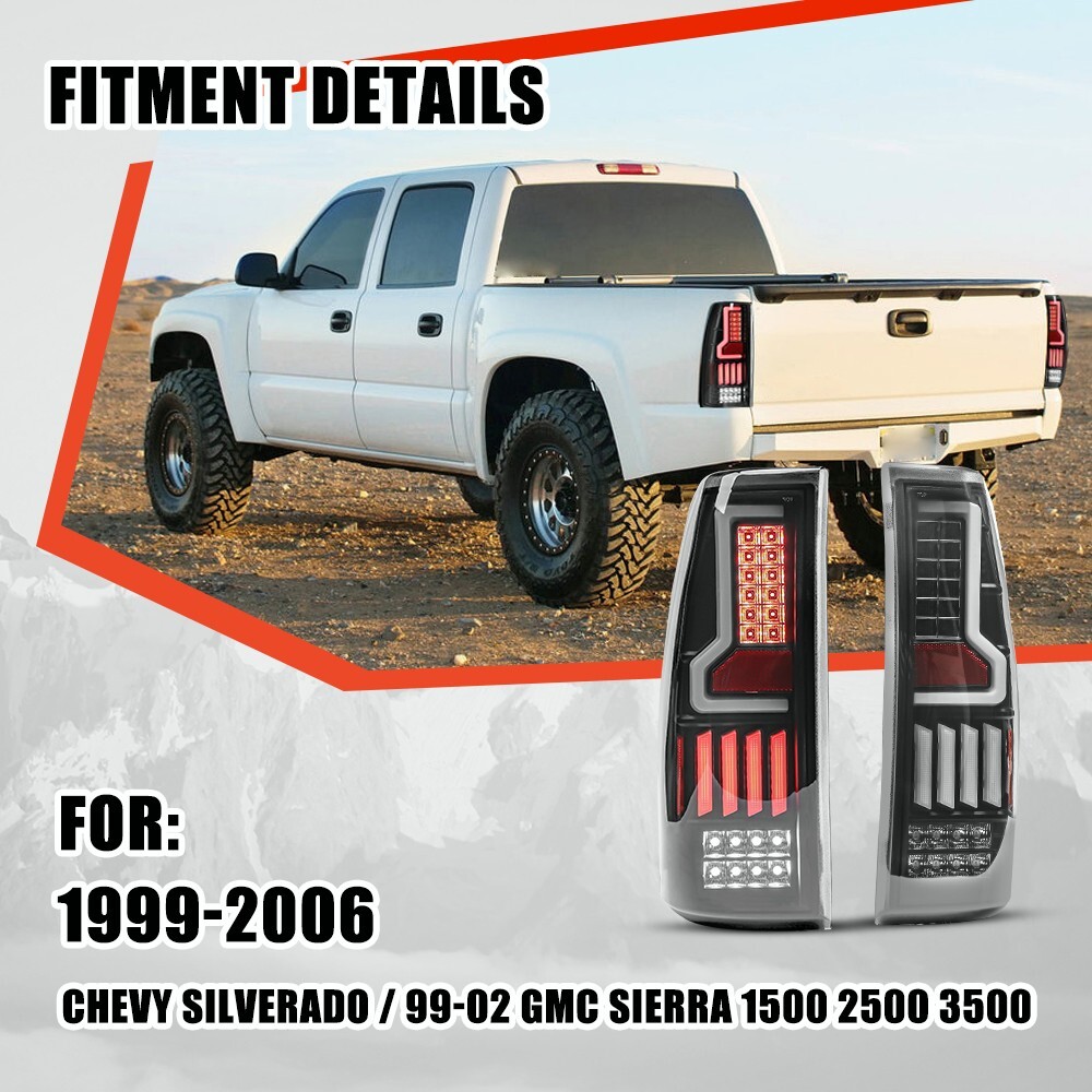 Head Lights Tail Lights Fog Lights Turn Signal Bumper Fender Flare Inner Fender Hubcaps Refrigerator Other Items for sale Head Lights Tail Lights Fog Lights Turn Signal Bumper Fender Flare Inner Fender Liners Portable Refrigerator Other Hot Sales Glossy Black / Clear Lens Chrome / Red Lens Specification: Color Finish: Glossy Black Housing / Clear Lens Light Source: LED Wiring Harness: Not Included (Plug and Play) Material:PMMA (OEM Grade) Waterproof: IP68 Certification: DOT/SAE Function: Brake/Running light +Turning Light+Backup Light Replaces Original (OE) Part #: L:15075531,19169004,19169021,15844155; R:15198460,19169005,19169022,19169024 Partslink NO: L:GM2800186; R:GM2801186 Fitment: 1999-2006 Chevy Silverado 1500 1999-2006 Chevy Silverado 2500 2001-2006 Chevy Silverado 3500 1999-2003 GMC Sierra 1500 1999-2003 GMC Sierra 2500 2001-2003 GMC Sierra 3500 ※ For 2007 Chevy Silverado with Classic Body Style Only Pls Note: For 99-02 Models (with only 3 Sockets) May need to add the caps in the box to plug up the side mark socket. Package Includes: 1 pair of tail lights (Left and Right side)