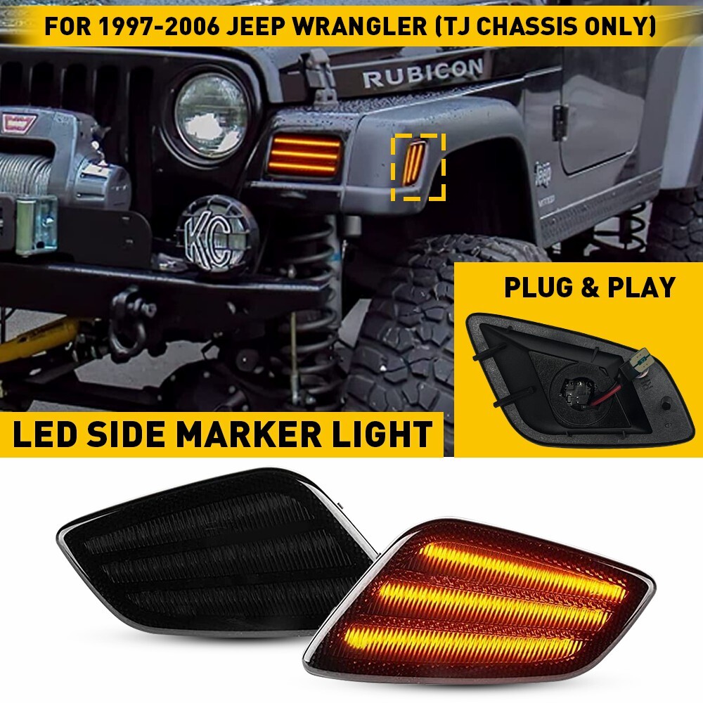 These smoked LED side markers are a perfect upgrade for my Jeep TJ! The fit is spot-on, just like OEM, and the smoked housing gives it a sleek, aggressive look. The LEDs are super bright, making my Jeep more visible at night, and the IP67 waterproof rating gives me peace of mind off-road. Installation was a breeze—plug-and-play with no wiring issues. The build quality feels solid, and after a few months of use, they still look and work like new. Definitely worth it for anyone wanting to modernize their TJ!