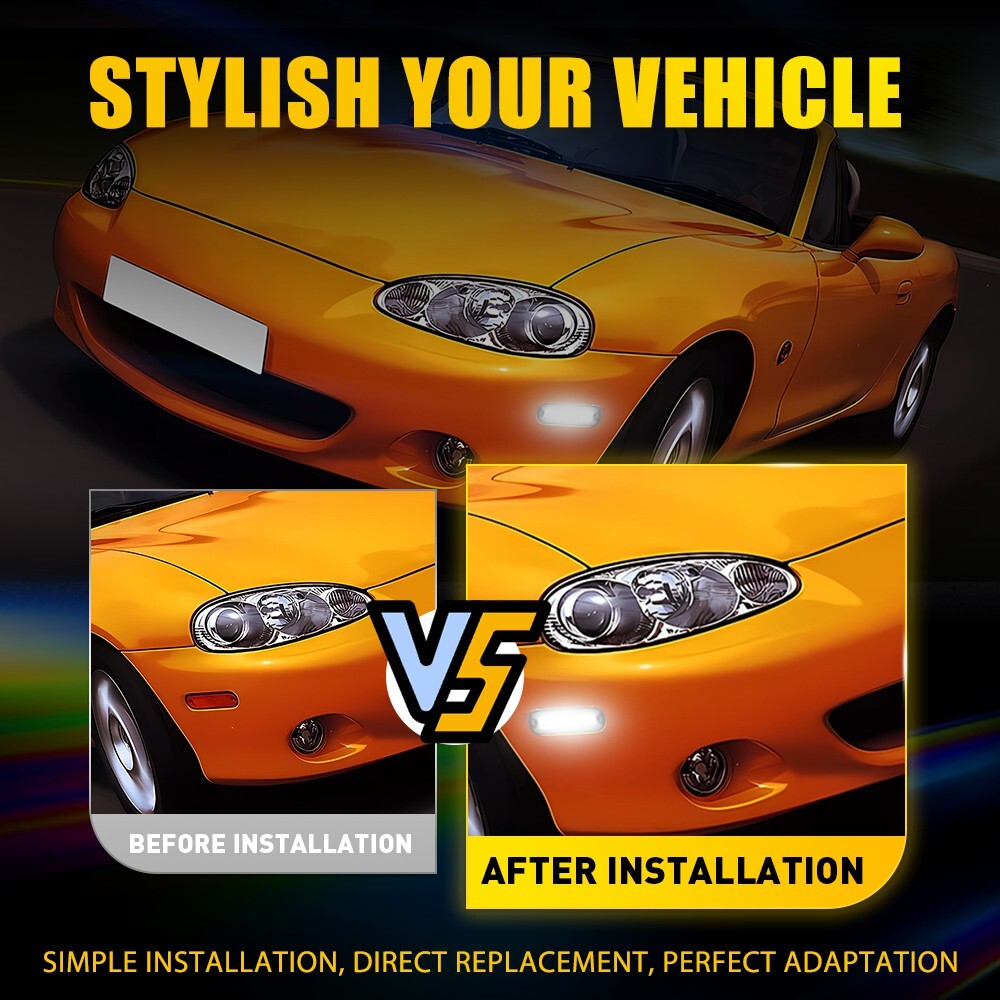 Fit for: 1990-2005 Mazda Miata MX-5 Specifications: Lens color: Smoked Mode: White (constantly illuminated) Waterproof grade: IP67 Service life: 50000 h+ Placement on vehicle: Front or rear fender Features: *Exquisite Appearance: Attractive side light is 1:1 design according to the original model for fitting the car perfectly. *High Brightness: Powerful LEDs is designed for visually striking and visibility enhancing. *Water-Proof: Ultrasonic technology makes waterproof ability stronger to ensure your driving safety (waterproof grade: IP67). *Stable Performance: 2X LED Side Marker Light Smoked Lens Front FOR Rear MAZDA MX-5 MIATA 1990-2005 Fit for: 1990-2005 Mazda Miata MX-5 Specifications: Lens color: Smoked Mode: White (constantly illuminated) Waterproof grade: IP67 Service life: 50000 h+ Placement on vehicle: Front or rear fender Features: *Exquisite Appearance: Attractive side light is 1:1 design according to the original model for fitting the car perfectly. *High Brightness: Powerful LEDs is designed for visually striking and visibility enhancing. *Water-Proof: Ultrasonic technology makes waterproof ability stronger to ensure your driving safety (waterproof grade: IP67). *Stable Performance: Longer service life (more than 50,000 hours) with friendly customer support for bringing you satisfied shopping experience. *Less Consumption: Better energy-saving, better environmental protection. Note: In order to ensure the item fit your vehicle properly, please check and confirm the model before purchasing. Packaging include: LED Side Light * 2 Item Specifics Brand AUXITO Number of Bulbs 2 Lens Color Smoke/Tinted Housing Color Smoke Light Color Cold White Type Side Marker Light Assemblies Placement on Vehicle Front, Rear, Left, Right Fitment Type Direct Replacement Features DOT-Certified, ISO-Certified, SAE-Certified Manufacturer Part Number NA01515FX, 8BN1-51-120 OE/OEM Part Number NA01515FX, 8BN1-51-120 Interchange Part Number NA01515FX, 8BN1-51-120 Items Included 2pcs Side Marker Light Voltage 12 V Mounting Style Clip-on Universal Fitment No Color Temperature 6000K Manufacturer Warranty 2 Years Fit for 1990-2005 Mazda Miata MX-5 Mode White (constantly illuminated) Payment Returns DESCRIPTION PAYMENT SHIPPING RETURN POLICY CONTACT US Shop Category Store Home LED Headlight ◈ H4 ◈ H13 LED FogLight ◈ H10 / 9145 / 9140 LED Reverse Light ◈ T15/921/W16W LED Side Marker Light Car Parts & Accessories Tail Light assemblies Other Hot Item Picture New List Item H11 H8 LED Headlight Kit High Low Bulb Beam Super Bright 6500K White 360000LM USD 42.74 BA15S 1156 Amber LED Signal Turn Light Bulb Error Free Anti Hyper Flash 2Set USD 34.48 H10 9145 9040 LED Fog Light Bulb DRL Extremely Bright Foglight AUXITO 2/10x USD 12.34 7443 Red Alert Flash 7440 Strobe LED Blinking Brake Light Tail Bulb Lamp 2F 2/8x USD 15.19 9005 HB3 Kit High Lo LED Headlight Bulb Beam Super Bright 9000LM 6500K 48W 2~10X USD 18.99 Help & Info Payment Policy Shipping Policy Return Policy FAQ About Us 2X LED Side Marker Light Smoked Lens Front FOR Rear MAZDA MX-5 MIATA 1990-2005 Fit for: 1990-2005 Mazda Miata MX-5 Specifications: Lens color: Smoked Mode: White (constantly illuminated) Waterproof grade: IP67 Service life: 50000 h+ Placement on vehicle: Front or rear fender Features: *Exquisite Appearance: Attractive side light is 1:1 design according to the original model for fitting the car perfectly. *High Brightness: Powerful LEDs is designed for visually striking and visibility enhancing. *Water-Proof: Ultrasonic technology makes waterproof ability stronger to ensure your driving safety (waterproof grade: IP67). *Stable Performance: Longer service life (more than 50,000 hours) with friendly customer support for bringing you satisfied shopping experience. *Less Consumption: Better energy-saving, better environmental protection. Note: In order to ensure the item fit your vehicle properly, please check and confirm the model before purchasing. Packaging include: LED Side Light * 2 Payment Returns All rights reserved. On Apr 22, 2025 at 05:10:56 PDT, seller added the following information: