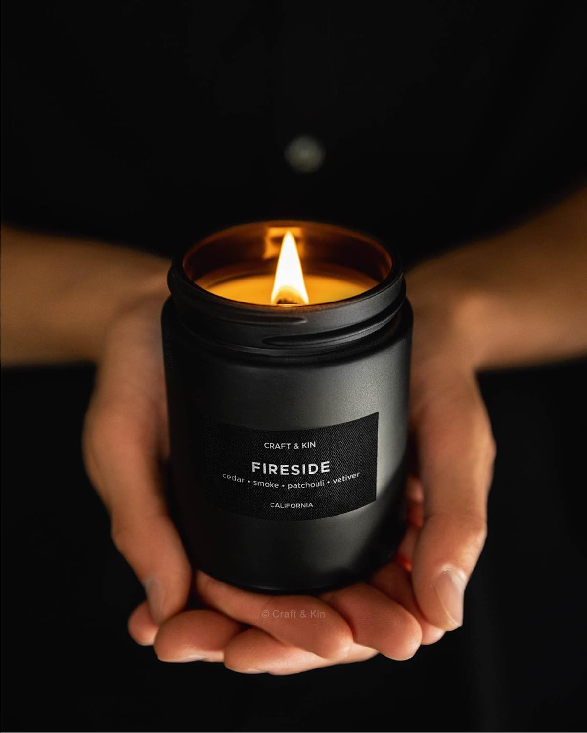 MASCULINE ELEGANCE: Immerse yourself in the magical allure of our fall scented candles crafted specifically for men. Designed to capture the essence of the season and the cozy warmth of masculine charm, these candles are an irresistible delight. Perfect for those who savor luxury and the comforting scents of the season, each gift comes in captivating, ready-to-give packaging. Elevate your gift-giving experience with this thoughtful and unforgettable present for any man deserving of a touch of elegance. PREMIUM SOY CANDLE: These 100% natural soy wax, wood wick fall candles are safe to use and long-burning. This Fireside aromatherapy candle for home is made with essential oils that bring you a strong masculine fragrance to your home. CANDLE FOR MEN: Have you looked for a candle for men for a long time? We’ve designed the perfect one for you and your loved ones. It comes with a strong masculine scent and a stylish black design. LONG LASTING SCENT: This 7.6 oz scented candle will bring in the masculine notes of cedar, smoke, patchouli, and vetiver to your home. Enjoy this luxury candle made with the finest essential oils to bring you a lasting and strong scent. OUR MISSION: The Craft & Kin Collection is carefully designed and crafted with your home and family in mind. We believe that your home should be a collection of people and things you love. Our mission is to help you craft a little more of that love with your kin. Product Description Aromatherapy candle These soy candles are made with strong essential oils that will create an enjoyable ambiance in your home. 100% Natural Soy Wax Each candle is made with 100% premium soy wax. Strong Essential Oils A highly scented candle made with a blend of essential oil mixtures. Wood Wick Featuring a wood wick for the ultimate "fireplace"-like atmosphere. Elegant Packaging Our scented candles come in a giftable black box for the ultimate experience. 1 100% Natural Soy Wax 2 Strong Essential Oils 3 Wood Wick 4 Elegant Packaging Fireside Featuring the masculine notes of cedar, smoke, patchouli, and vetiver. Lavender Woods The mystical notes of grapefruit, lavender, vetiver, and moss. Pine & Clove Woodsy pine, musk, oakmoss, and clove mix together in this earthy scent. Smoke & Vanilla Bergamot, sandalwood, leather, and vanilla meet to form this unique blend. Vintage Leather A blend of birch, amber, Vintage leather, and cedarwood. 1 Fireside 2 Lavender Woods 3 Pine & Clove 4 Smoke & Vanilla 5 Vintage Leather