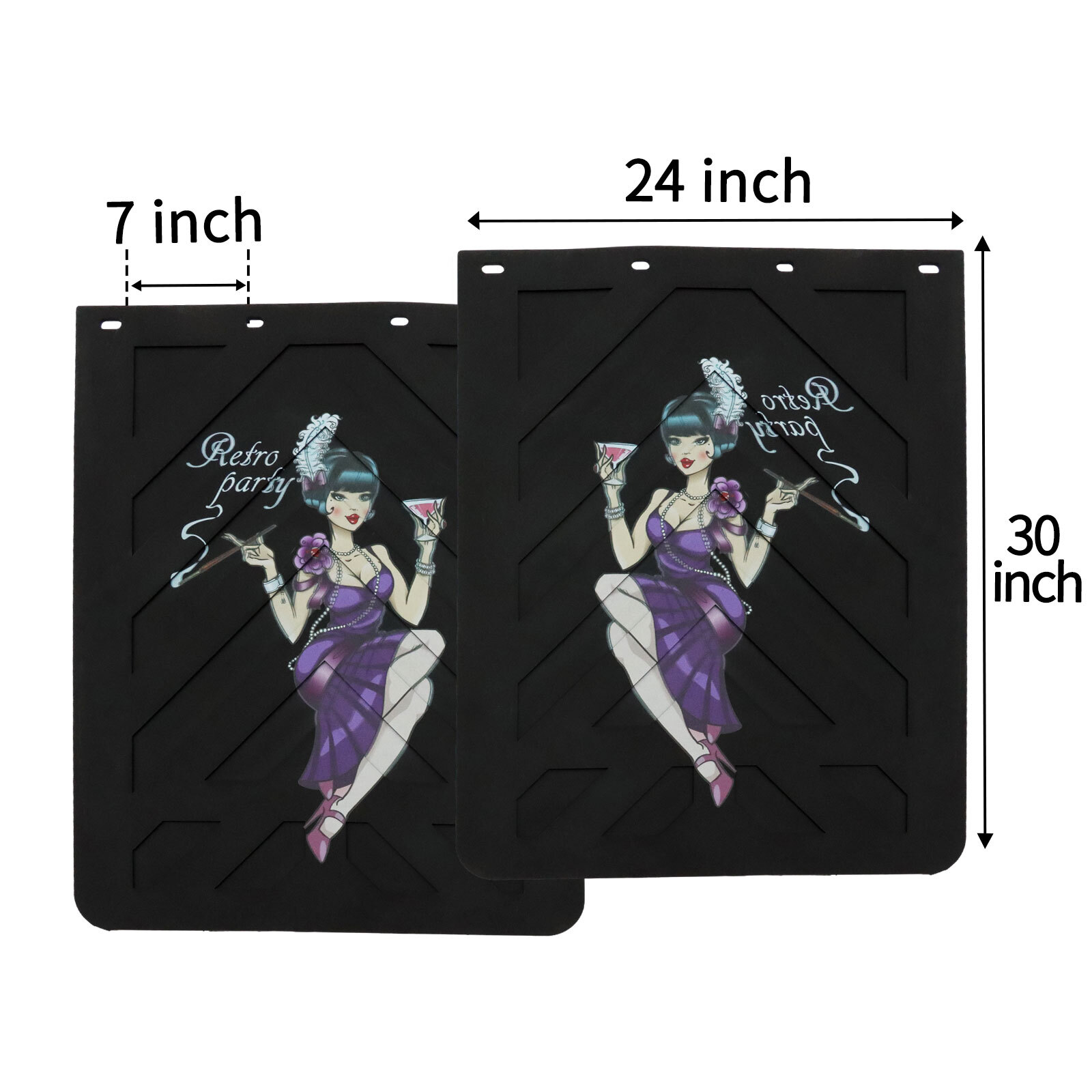 Material : PVC Thickness: 1/5 inches Compatible With Semi Truck: Freightliner Kenworth Peterbilt International Mack Volvo Size: Length * Width:24" x 30"; Made from 1/5 inch thick heavy-duty polymer for durability in severe road conditions. Design:The mud flaps feature a micro-groove pattern design, facilitating the swift diversion of rainwater and debris to prevent accumulation and splashing. Durability: Made from a robust combination of high-quality plastic and rubber, our mud flaps resist breaking, deformation, and curling. Unaffected by extreme temperatures, ensuring they won't easily deform in either scorching heat or freezing cold. Mud flaps feature a custom flag design, providing a distinctive and unique pattern to add a personalized touch to your truck. Friendly Reminder: Avoid using a high-pressure water gun to clean the fenders with patterns, as this may cause them to detach.