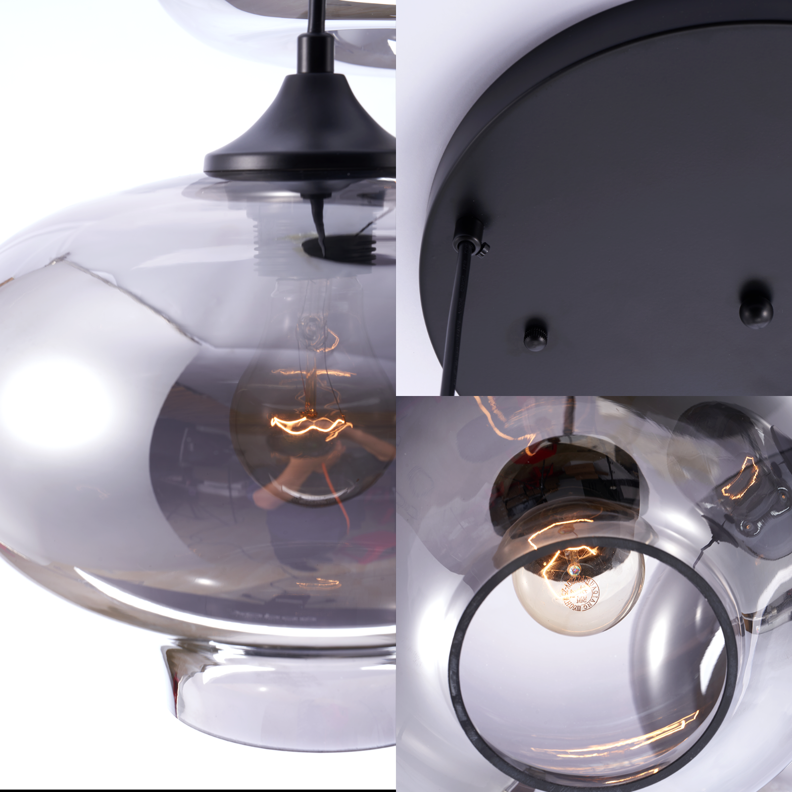 Smoky Glass 3-Lights Pendant Lighting Chandeliers Modern Ceiling Lamp Fixtures About this item 【Vintage&Contemporary Design】This cluster glass pendant light features 3 different shaped smoke gray glass lampshades, under the black metal canopy, it combines the contemporary and vintage style so that perfect for any home decoration styles, while lights on, 3-Light glass globe chandelier creates a charming ambiance 【Bulbs Requirement】Modern glass pendant light is compatible with E26 bulbs, 3 bulbs are required (Bulbs not included); Voltage: 110-120V, Max-60w, bulbs type: Incandescent, LED bulbs, energy saving bulbs, halogen bulbs etc. If installing dimming bulbs, it can display different lights with the wall dimmer switch to create different atmospheres 【Product Dimensions】3 Lampshades with different size- Lamshade 1: 7.5" x 7.1" (W x H), Lamshade 2: 10.6" x 5.5" (W x H), Lamshade 3: 9.8" x 7.5" (W x H), Ceiling Plate: 12" x 1" (Dia x H), Adjustable wire cord: 39". Max length of the pendant lights is 46.5". Min is about 8.5". This vintage kitchen pendant lighting over island can be used on a flat, sloped or vaulted ceiling 【Perfect for Any Space】Versatility is key. This pendant light is designed to enhance a wide range of indoor spaces, including your kitchen island, hallway, or kitchen sink, warehouse, farmhouse areas. Its timeless design and warm lighting make it suitable for both residential and commercial settings. PRODUCT INTRODUCTIONS: Modern Glass Pendant Light is elegant and unique, these smoke gray glass shades is well designed with an upgraded bigger size, three extremely creative shades with different shapes are combined to show your unique taste and make your room full of modern sense. SPECIFICATION: Style: Modern and Vintage Material: Glass, Metal Color: Black Glass Shade Color: Smoke Gray Lampshade Size: Lampshade 1: 7.5" x 7.1" (W x H) Lampshade 2: 10.6" x 5.5" (W x H) Lampshade 3: 9.8" x 7.5" (W x H) Metal Ceiling Canopy: Diameter 12'' Hanging Wires: 39", Adjustable Suitable Voltage: 110V Light Source: 3 x E26 LED bulbs, each 60max( Bulbes Not included) Bulb Type: Incandescent,Led,CFL (Bulbs Not Included) Dimmable: Yes (Dimmer Switch Not Included) Use For: Living Room/Dining Room/Kitchen Island Table/Bedroom//Study Room/Staircase/Restaurant etc. WARM TIPS: 1. Please check the dimensions before ordering, just to ensure it is suitable for your room. 2. Please check carefully the installation instructions before you are ready to install the chandelier. 3. Ensure the fixture is disconnected from mains power before installation. Payment Delivery details Terms of sales About us Contact us Payment You could make payment via: Delivery details Packages will ship via by UPS or USPS within our handling time,once the package is shipped out ,normally shipping takes about 3-10 working days,but due to different cities and states,shipping time will be different. Terms of sales If you any problem about shipping information, or the item you got : Arrived damaged; Wrong item sent; Missing parts or pieces; Doesn't work or defective; Doesn't match description or photos. Pls click "Contact Seller" and send us message firstly. Then we could have a check and will take responsibility to resolve the problem with you in good communication. About us Our company specializing in selling all kinds of light fixtures,such as ceiling fans,chandeliers,crystal lights,retro lamps,pendant light,etc. If there's any light fixture you are interested,pls feel free to contact us for more details. Contact us Normally your message will be replied in 1 business day,If after 24 hours you do not receive our reply,please kindly re-send us the message,because sometimes ebay message system will have technical problem,so your message can't send to us successfully.