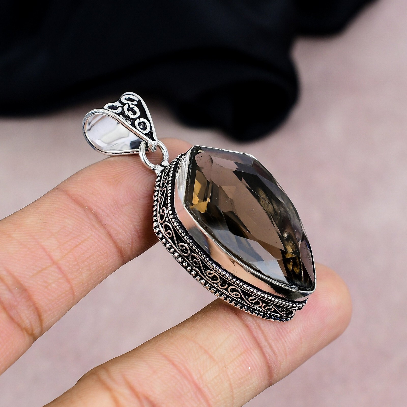 Features:HandmadeStyle:PendantMetal:Sterling SilverMetal Purity:925Main Stone Color:BrownSetting Style:BezelPendant Shape:Same As PictureCut Grade:N/ASecondary Stone:N/AMain Stone Shape:Same As PictureType:PendantColored Diamond Intensity:N/AChain Type:N/ACountry/Region of Manufacture:IndiaCertification:N/ACollection:HandmadeClosure:Same As PictureNumber of Gemstones:1Color:SilverDiamond Color Grade:N/AOccasion:Anniversary, Birthday, Christening, Christmas, Engagement, Father's Day, Graduation, Mother's Day, Valentine's Day, WeddingTheme:Beauty, Bohemian, Ethnic, Halloween, Love, NatureDiamond Clarity Grade:N/ABrand:HandmadeNumber of Diamonds:N/APendant/Locket Type:Same As PictureMaterial:GemstoneMain Stone Treatment:Not EnhancedBase Metal:Sterling SilverMain Stone Creation:NaturalMain Stone:Smoky QuartzCountry of Origin:IndiaNecklace Length:5.2"Total Carat Weight:10 carat and above