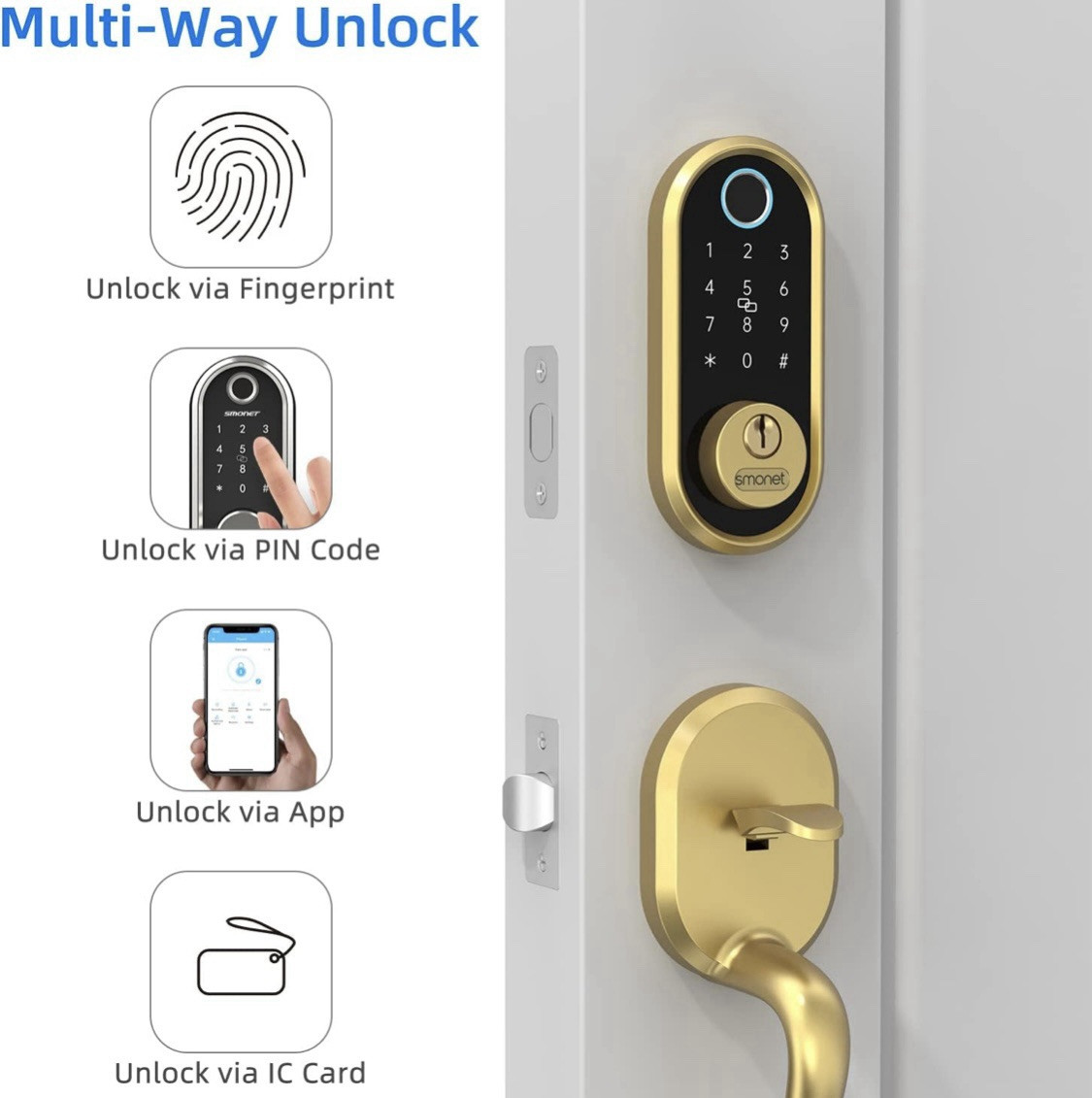 The Smonet Smart Door Lock Fingerprint Ekeys Keypad Bluetooth Y1-SBF-S is a modern, keyless smart deadbolt designed for both commercial and residential use. With a sleek gold color and easy installation instructions, this electronic lock offers a secure and stylish option for your front door or security door. Featuring fingerprint technology and reversible universal mounting, this smart lock provides convenience and peace of mind for your home or business. Smart door lock works with existing deadbolts. On Apr 4, 2025 at 23:43:41 PDT, seller added the following information: