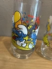 The product is a set of vintage 1980s Smurfs glasses featuring the characters Smurfette, Baker, and Jokey. These collectible glasses were manufactured by Peyo in 1982, part of the popular franchise "The Smurfs" TV show. The multicolor glassware is a nostalgic piece of animation merchandise that appeals to fans of cartoon characters and retro animation. Perfect for collectors of Smurfs memorabilia, these glasses bring a touch of whimsy and nostalgia to any display. I have two sets of these available. One set includes the three glasses you see pictured. Two sets is two of each glass pictured