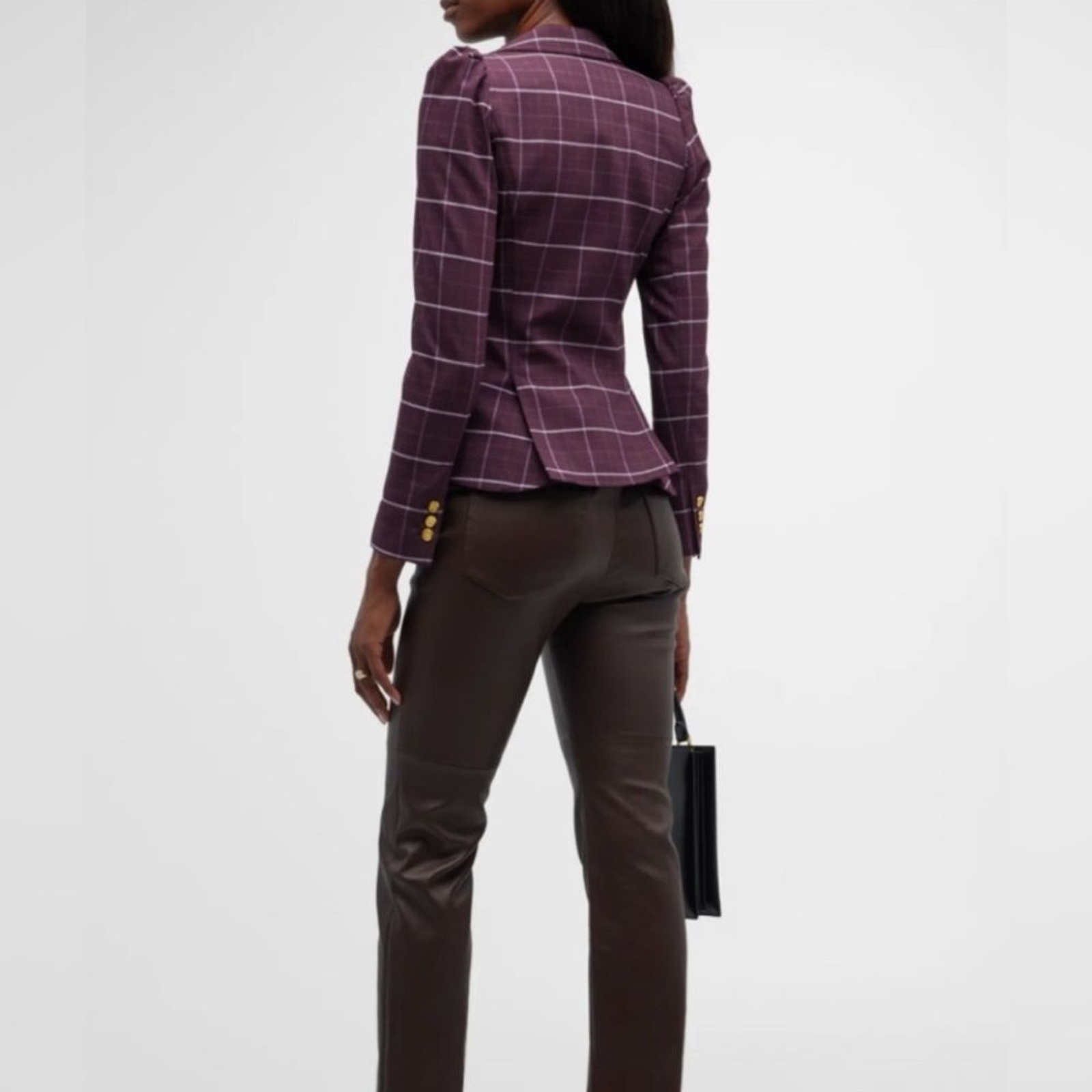 Mid-weight, low-stretch suitingPeaked lapels and single-breasted button placketLong puff sleeves with button cuffsPadded shouldersPlaid check patterFlap hip pockets and curved hemDouble vented backShell: 51% polyester/23% rayon/22% wool/2% cotton/2% elastaneLining: 60% acetate/40% viscoseDry cleanMade in Canada Gorgeous blazer Great condition Size XS, US2 Comes with tag