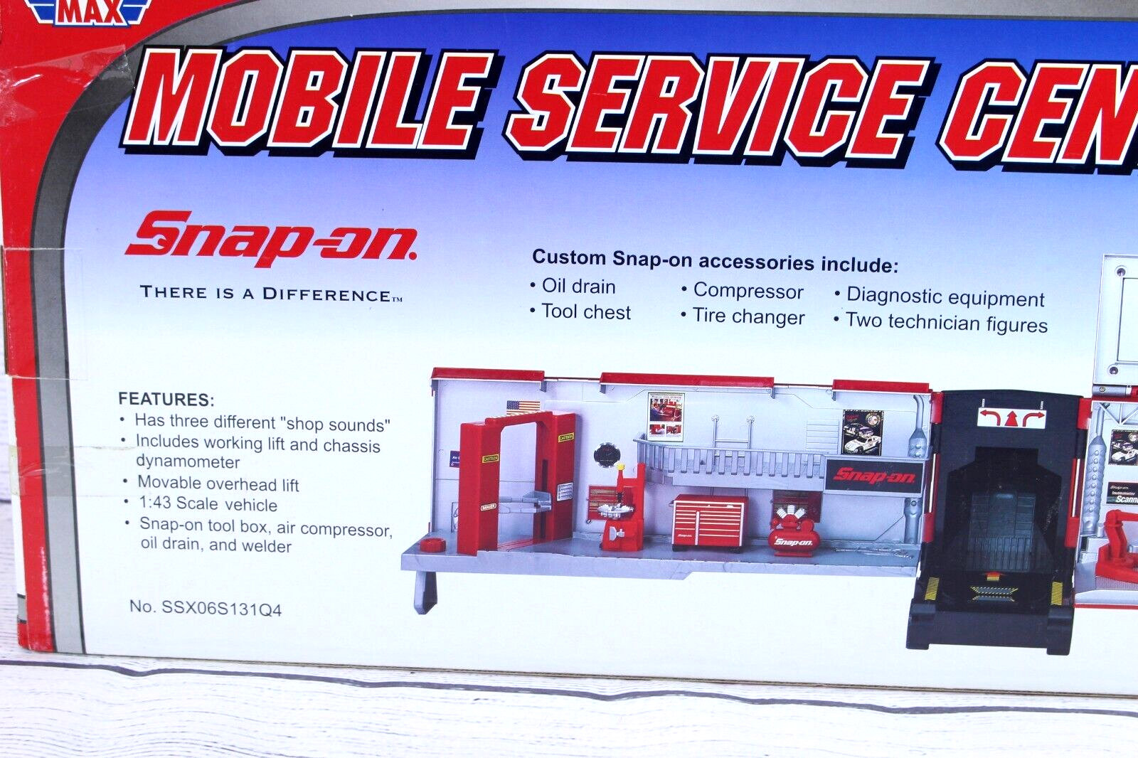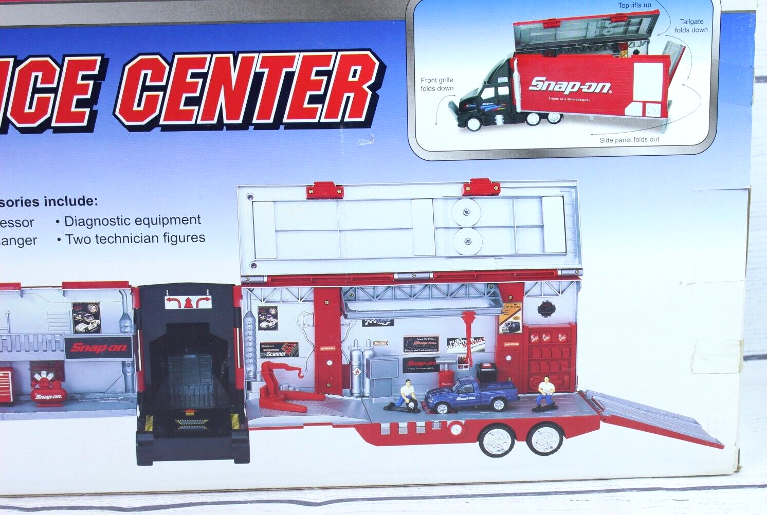 •2007 Snap-On Mobile Service Center truck diorama by Motor Max •Includes one diecast vehicle plus engine hoist and tune-up equipment •Features fold-out service center with detailed tool area and accessories •Built-in sound feature—press buttons to hear authentic Snap-On sounds •Truck measures approx. 23" long when opened •Still in original box—unused and in excellent condition •Great collectible for Snap-On enthusiasts or diecast display fans •Ships securely