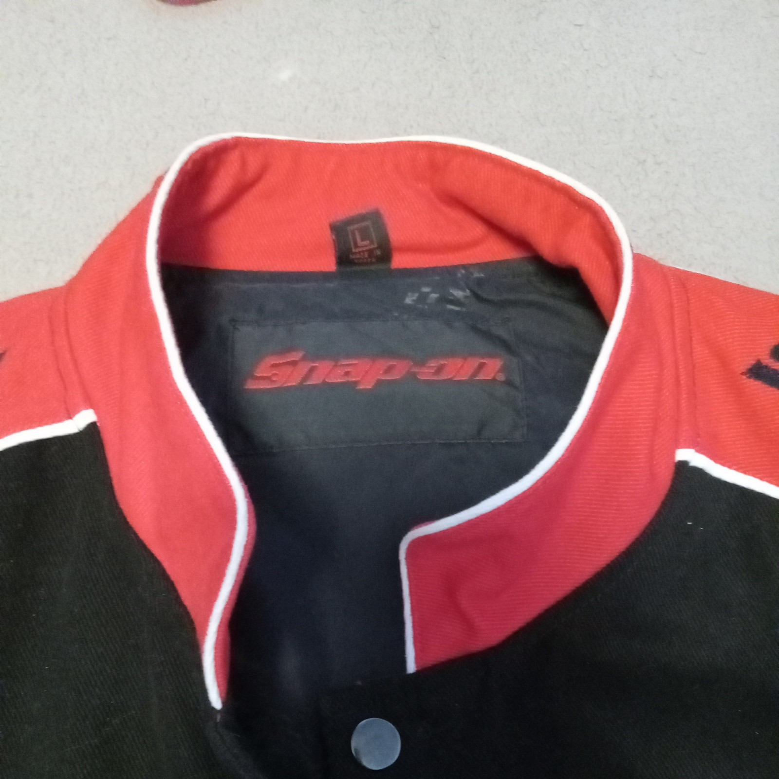 This black Snap-on Racing Jacket in size L for men features an embroidered logo and accents, with a solid pattern and snap closure. Made of cotton canvas with a nylon lining, the bomber jacket is perfect for travel or casual wear. It has a regular fit with pockets and is suitable for all seasons. The jacket is themed around cars, tools, and racing, conveying a 90s style.