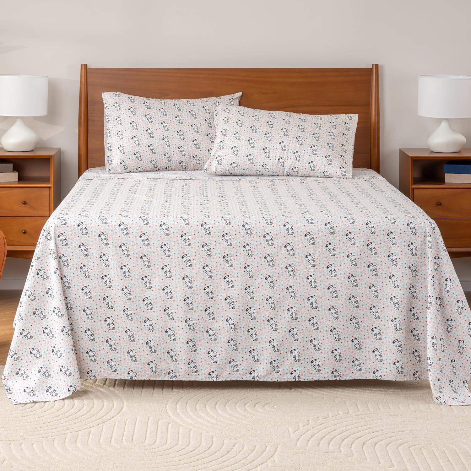 Full Microfiber Sheet Set Core Parameters Material: Polyester, Microfiber Size: Full (Fitted Sheet: 54"×75", Flat Sheet: 81"×96") Color: Mini Snoopy Spring Floral Happy Dance Soft Grey Weight: 2.59 lbs (1.17 kg) Technical Specifications • Official Peanuts Licensed Sheet Set featuring Snoopy characters • High-Quality 85GSM microfiber fabric for all-season comfort • Elastic fitted sheet fits mattresses up to 13 inches deep • Includes 1 flat sheet, 1 fitted sheet, and 2 pillowcases (20"×30") • Machine washable with cold water, gentle cycle drying Package Information Dimensions: 10.98×9.13×2.99 inches (27.9×23.2×7.6 cm) Unit Count: 4 pieces