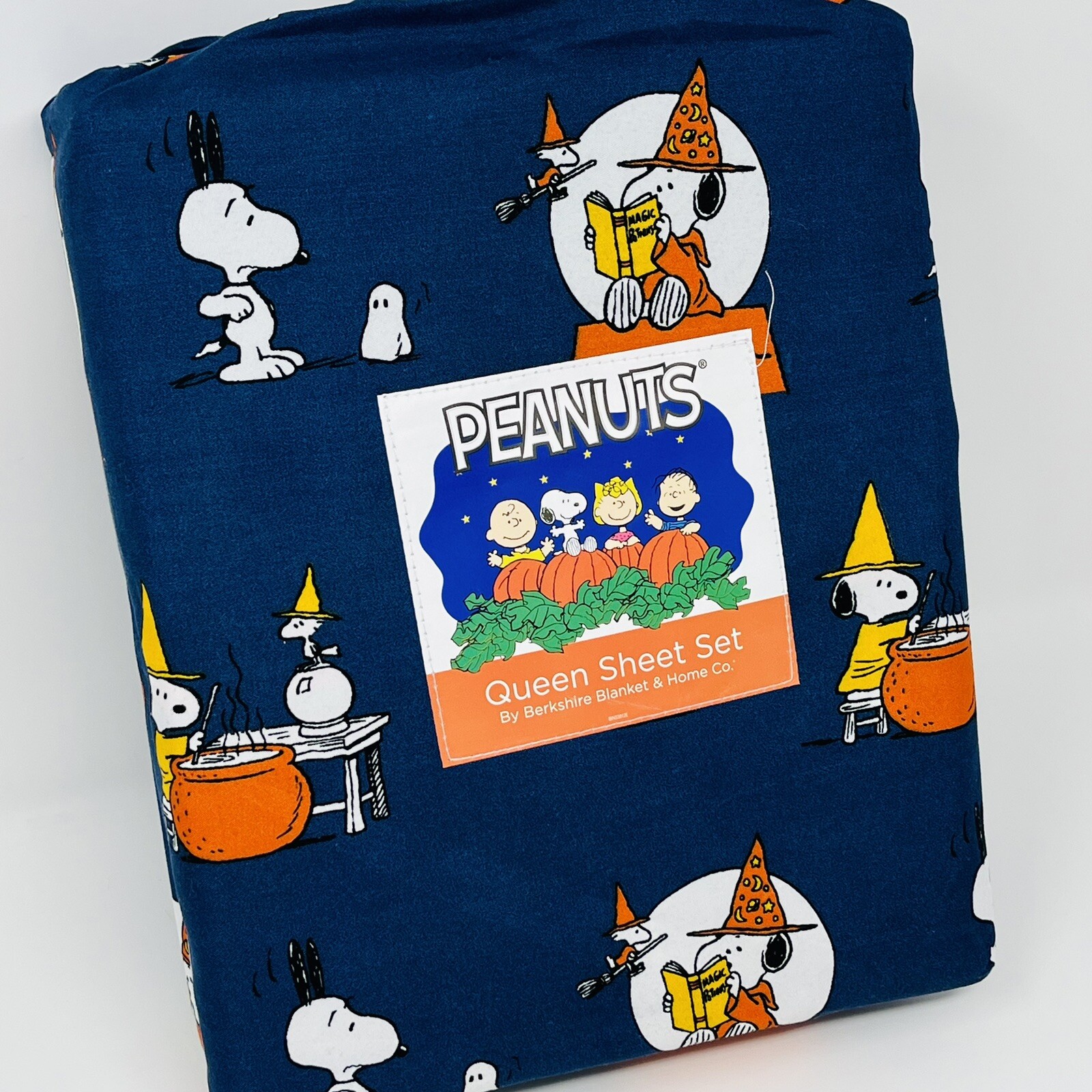 PEANUTS Snoopy QUEEN SHEETS SET Woodstock Halloween Witch Kettle Broom Full Moon