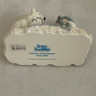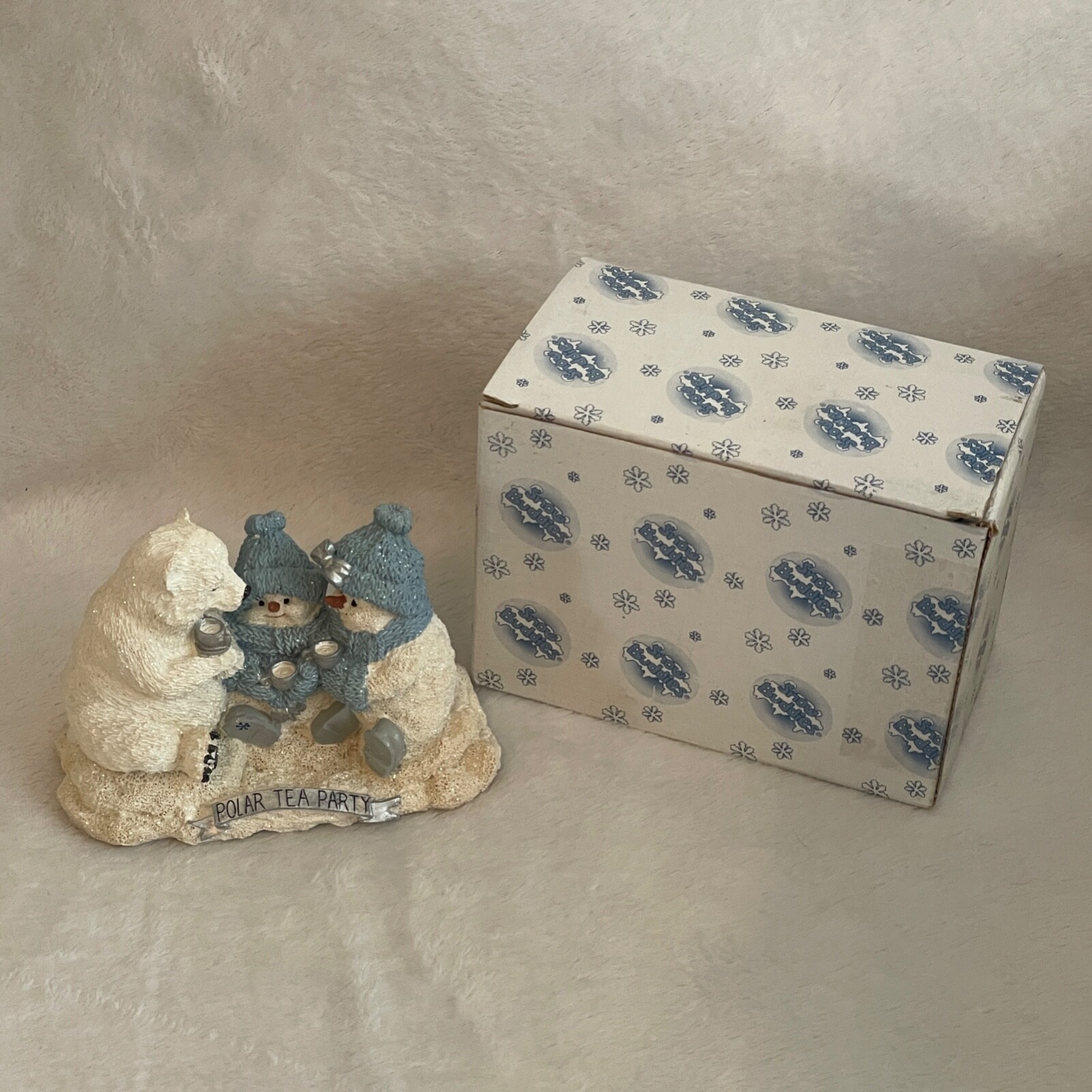 This Snow Buddies "Buddies Polar Bear Tea Party" Figurine is a charming winter-themed figurine featuring a snowman and snowlady enjoying a tea party with a polar bear. Manufactured in 1999, this figurine is designed in blue and white colors, showcasing a winter fun theme. This original piece captures the fun of the season with its adorable characters and festive tea party. Collector’s Limited Release - Series 2000. Made by The Encore Group, Inc. as part of their Snow Buddies collection. Manufactured in China. Overall, good condition. Some discoloration in places and a small white mark on the middle character's hat (appears to be a manufaturer’s flaw but not sure). See all photos for details. Approximately 4 inches tall x 5.75 inches in length. Comes in original box (does not include original styrofoam packaging) which has some wear. Also comes with a Snowbuddies tag. Ships in recycled Amazon box. Colors may vary by screen. H.M.455