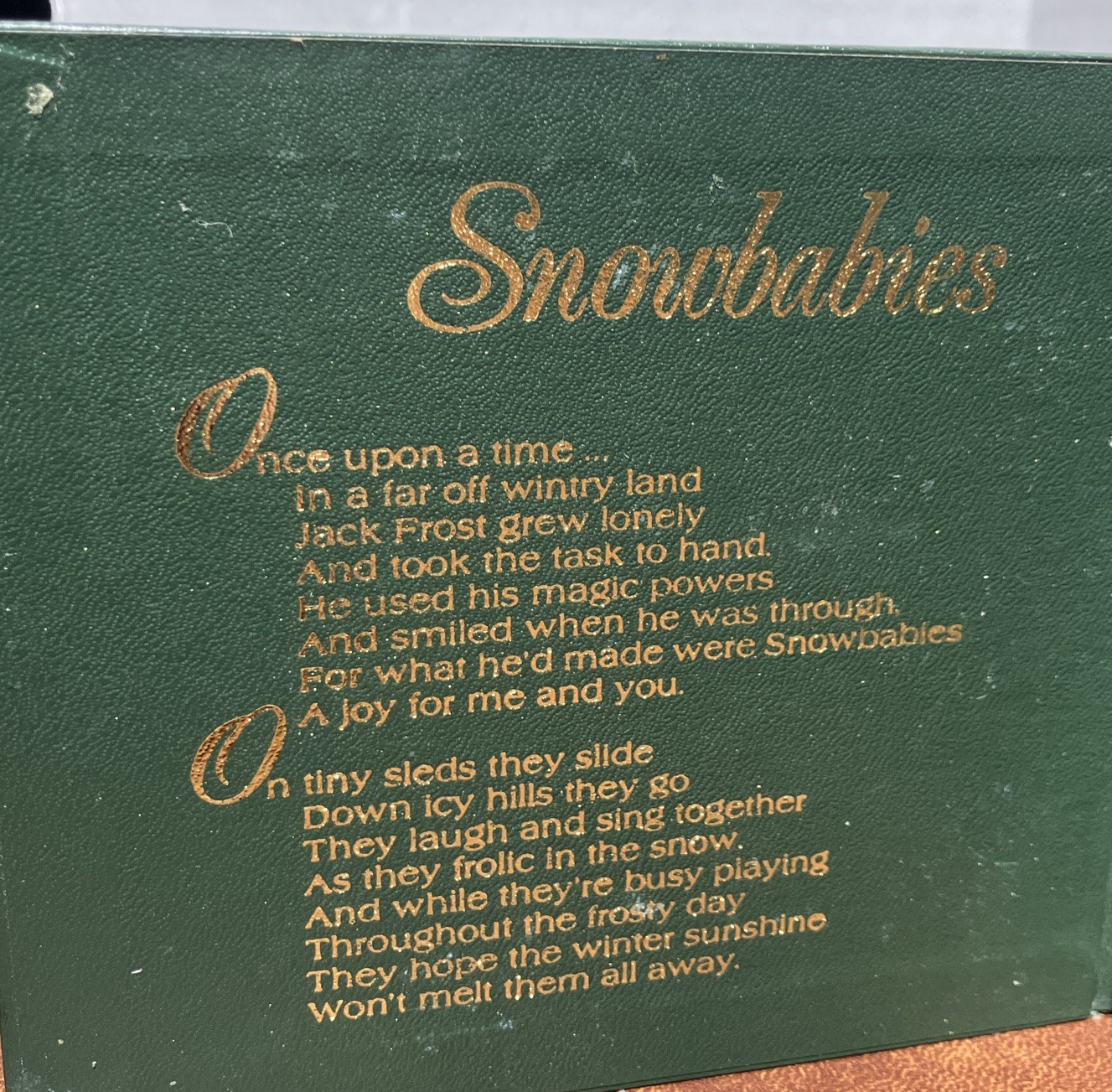 The product is a vintage Department 56 Snowbabies figurine from 1988, featuring a Snowbaby on a sled. This collectible item comes in its original box, making it a valuable addition to any holiday or seasonal figurine collection. Perfect for fans of Department 56 and collectors of adorable Snowbaby figurines, this piece captures the charm and nostalgia of winter scenes from 1988. Please feel free to contact me with any questions you have