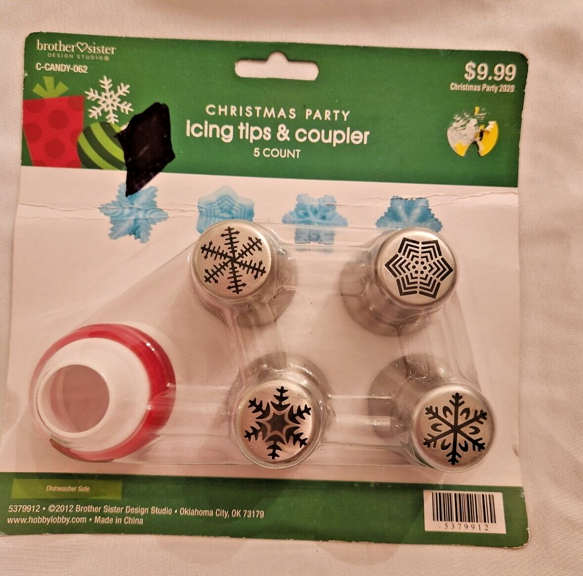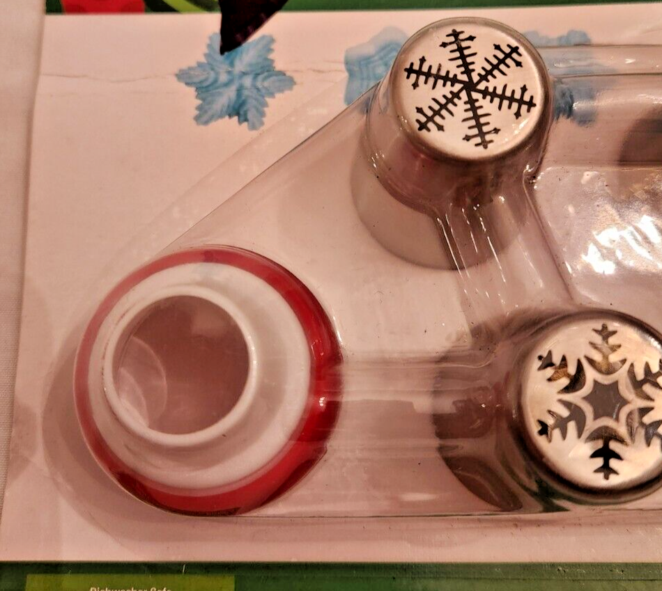 The "Snowflake Icing Tips and Coupler 4 pc. set" by Brother & Sister 2020 includes silver icing nozzles in snowflake designs. Perfect for decorating cakes and pastries, the set includes a coupler for easy nozzle attachment.